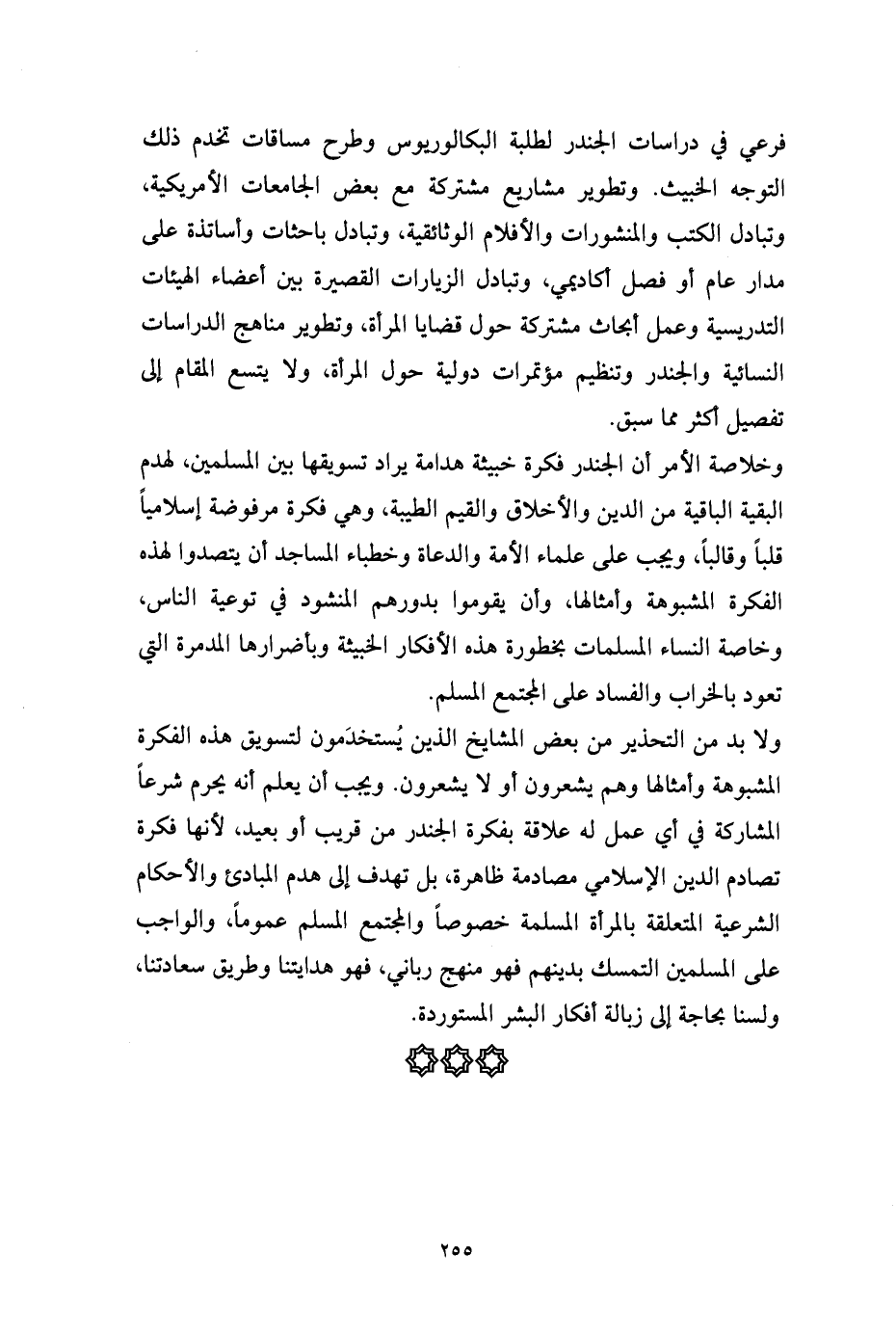 ولا بد من التحذير من بعض المشايخ الذين يُستخدَمون لتسويق هذه الفكرة المشبوهة وأمثالها وهم يشعرون أو لا يشعرون. ويجب أن يعلم أنه يحرم شرعاً المشاركة في أي عمل له علاقة بفكرة الجندر من قريب أو بعيد، لأنها فكرة تصادم الدين الإسلامي مصادمة ظاهرة، بل تهدف إلى هدم المبادئ والأحكام الشرعية المتعلقة بالمرأة المسلمة خصوصاً والمجتمع المسلم عموماً، والواجب على المسلمين التمسك بدينهم فهو منهج رباني،