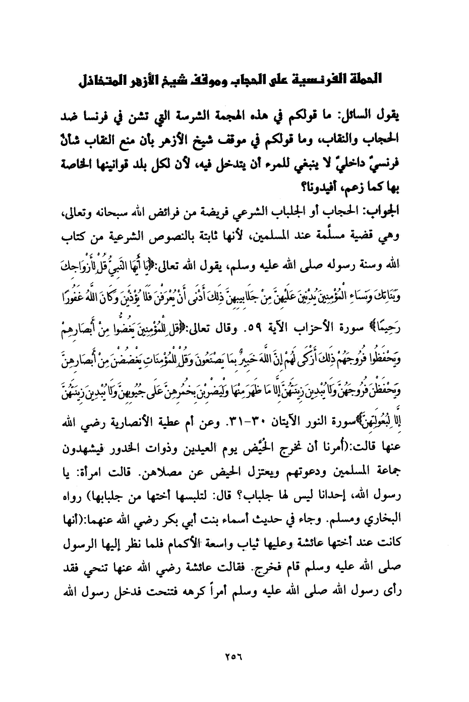 يقول السائل: ما قولكم في هذه الهجمة الشرسة التي تشن في فرنسا ضد الحجاب والنقاب، وما قولكم في موقف شيخ الأزهر بأن منع النقاب شأنٌ فرنسيٌ داخليٌ لا ينبغي للمرء أن يتدخل فيه، لأن لكل بلد قوانينها الخاصة بها كما زعم، أفيدونا؟