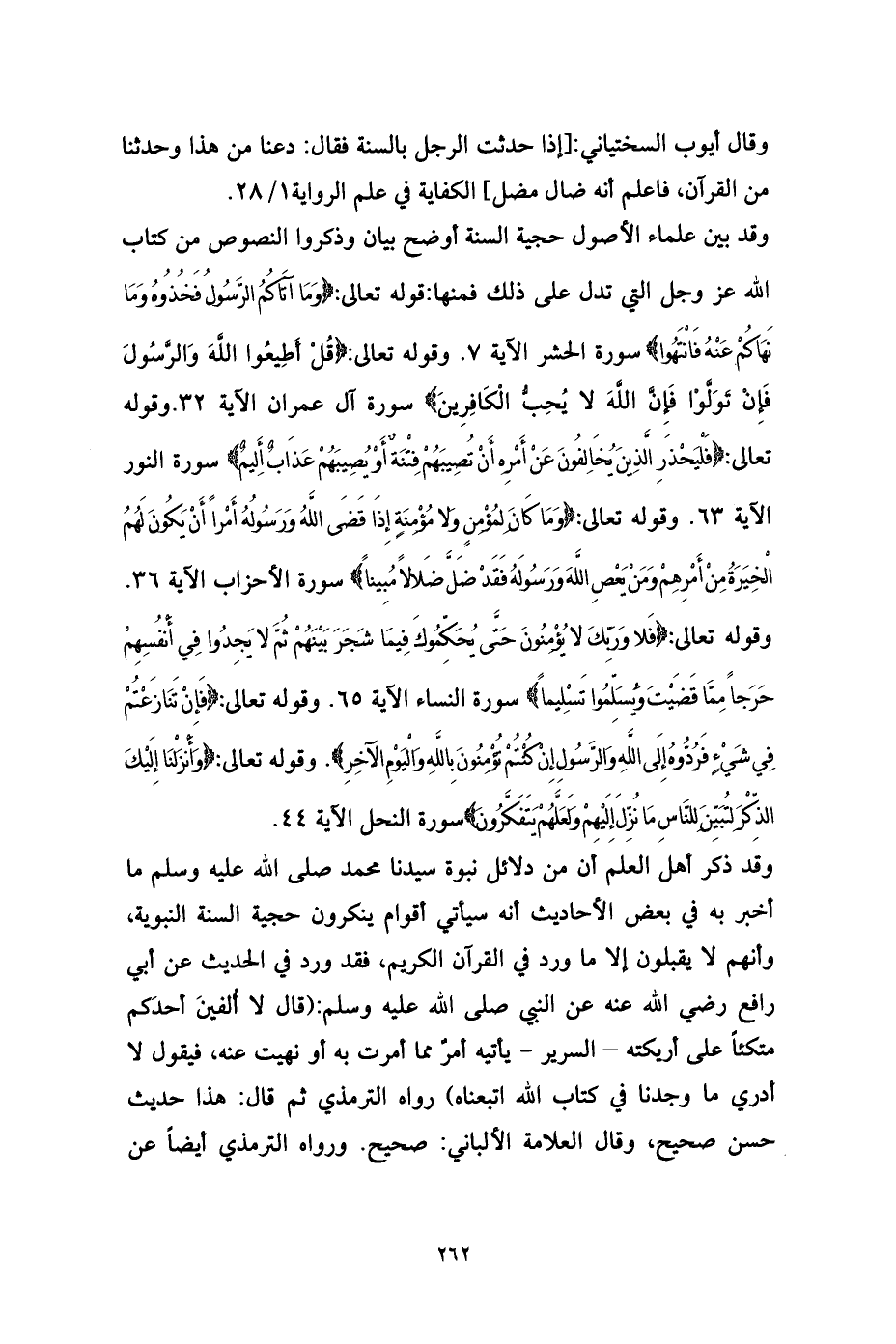 وقال أيوب السختياني: [إذا حدثت الرجل بالسنة فقال: دعنا من هذا وحدثنا من القرآن، فاعلم أنه ضال مضل] الكفاية في علم الرواية1/ 28.