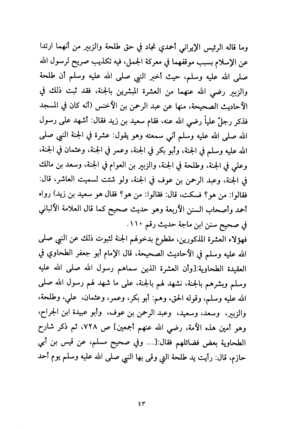 وما قاله الرئيس الإيراني أحمدي نجاد في حق طلحة والزبير من أنهما ارتدا عن الإسلام بسبب موقفهما في معركة الجمل، فيه تكذيب صريح لرسول الله صلى الله عليه وسلم، حيث أخبر النبي صلى الله عليه وسلم أن طلحة والزبير رضي الله عنهما من العشرة المبشرين بالجنة، فقد ثبت ذلك في الأحاديث الصحيحة، منها عن عبد الرحمن بن الأخنس (أنه كان في المسجد فذكر رجلٌ علياً رضي الله عنه، فقام سعيد بن زيد فقال: أشهد على رسول الله صلى الله عليه وسلم أني سمعته وهو يقول: عشرة في الجنة النبي صلى الله عليه وسلم في الجنة، وأبو بكر في الجنة، وعمر في الجنة، وعثمان في الجنة، وعلي في الجنة، وطلحة في الجنة، والزبير بن العوام في الجنة، وسعد بن مالك في الجنة، وعبد الرحمن بن عوف في الجنة، ولو شئت لسميت العاشر، قال: فقالوا: من هو؟ فسكت، قال: فقالوا: من هو؟ فقال هو سعيد بن زيد) رواه أحمد وأصحاب السنن الأربعة وهو حديث صحيح كما قال العلامة الألباني في صحيح سنن ابن ماجة حديث رقم 110.
