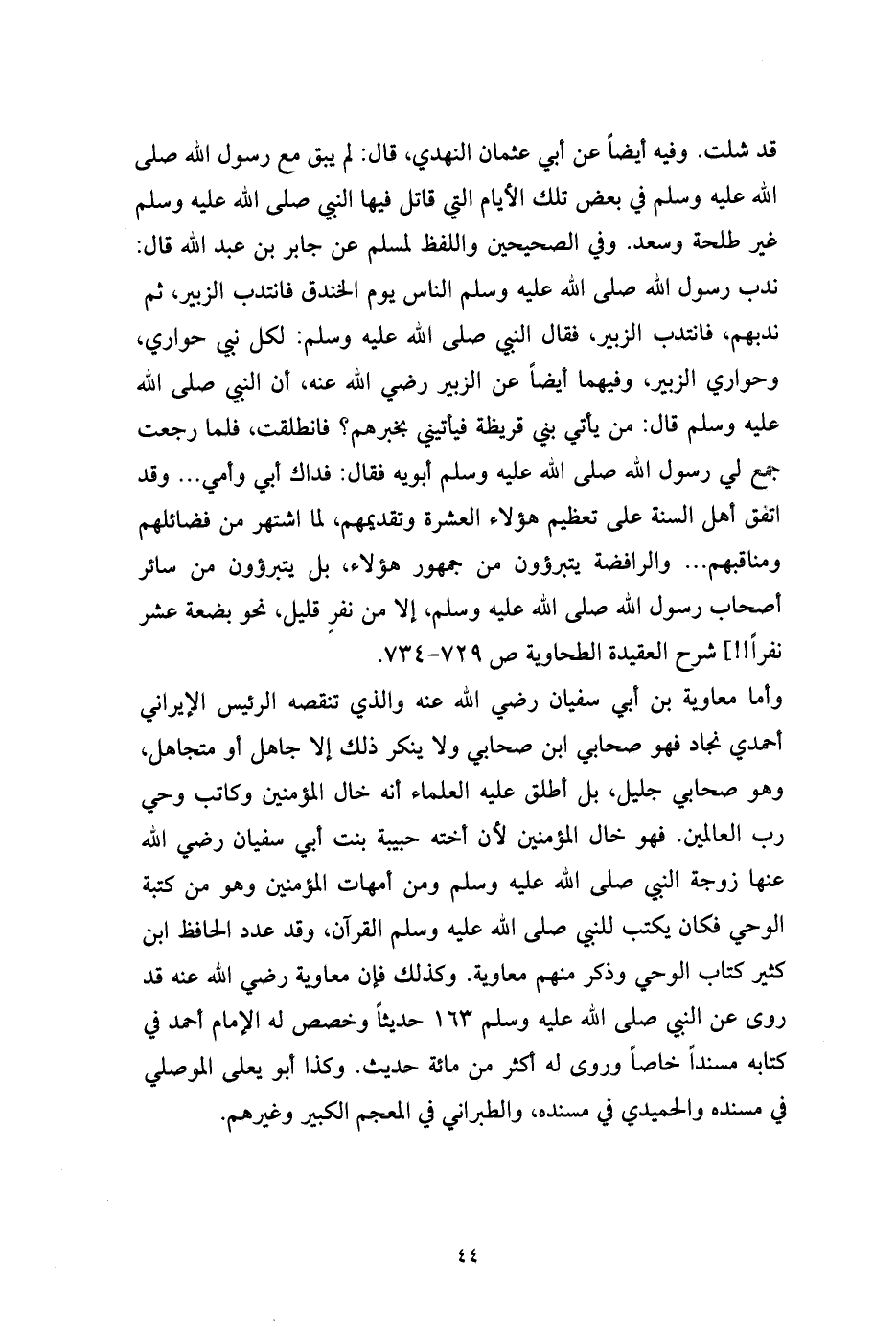 قد شلت. وفيه أيضاً عن أبي عثمان النهدي، قال: لم يبق مع رسول الله صلى الله عليه وسلم في بعض تلك الأيام التي قاتل فيها النبي صلى الله عليه وسلم غير طلحة وسعد. وفي الصحيحين واللفظ لمسلم عن جابر بن عبد الله قال: ندب رسول الله صلى الله عليه وسلم الناس يوم الخندق فانتدب الزبير، ثم ندبهم، فانتدب الزبير، فقال النبي صلى الله عليه وسلم: لكل نبي حواري، وحواري الزبير، وفيهما أيضاً عن الزبير رضي الله عنه، أن النبي صلى الله عليه وسلم قال: من يأتي بني قريظة فيأتيني بخبرهم؟ فانطلقت، فلما رجعت جمع لي رسول الله صلى الله عليه وسلم أبويه فقال: فداك أبي وأمي ... وقد اتفق أهل السنة على تعظيم هؤلاء العشرة وتقديمهم، لما اشتهر من فضائلهم ومناقبهم ... والرافضة يتبرؤون من جمهور هؤلاء، بل يتبرؤون من سائر أصحاب رسول الله صلى الله عليه وسلم، إلا من نفرٍ قليل، نحو بضعة عشر نفراً!!] شرح العقيدة الطحاوية ص 729 - 734.