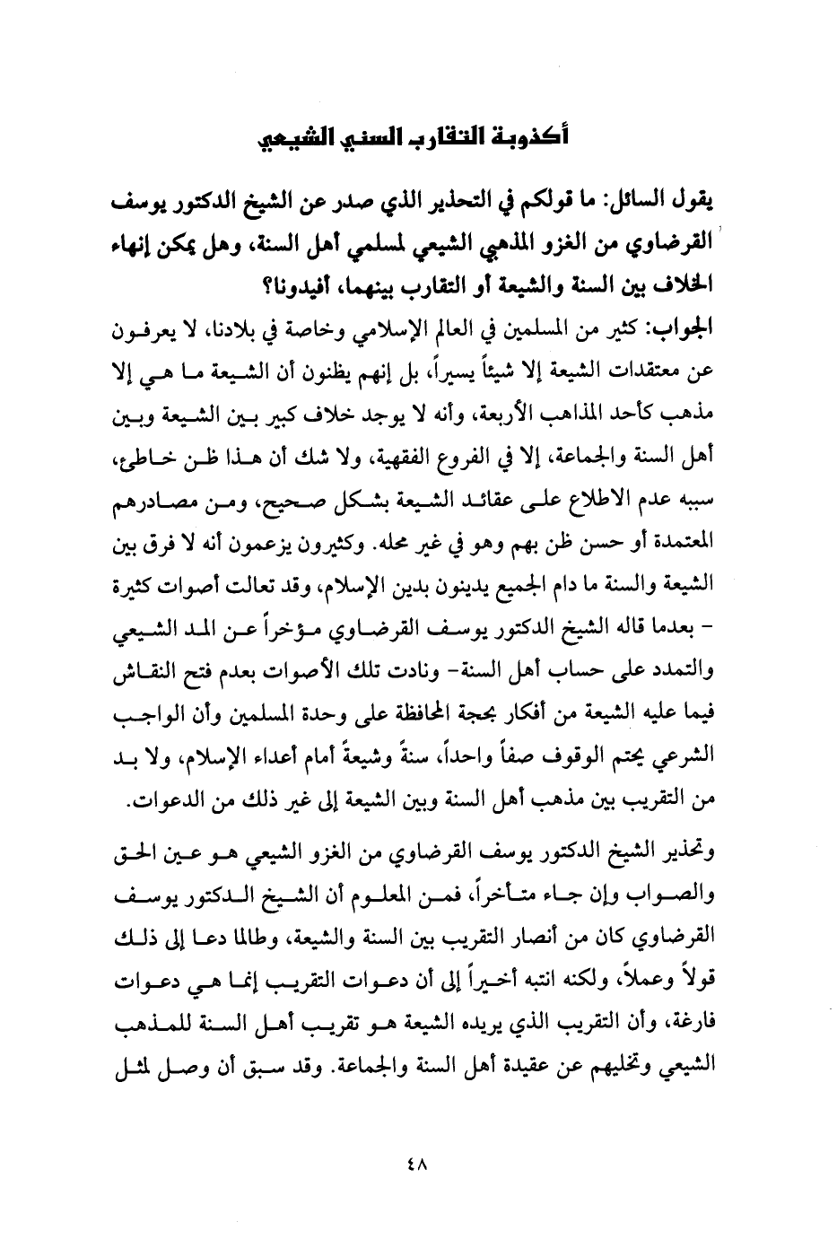 وتحذير الشيخ الدكتور يوسف القرضاوي من الغزو الشيعي هو عين الحق والصواب وإن جاء متأخراً، فمن المعلوم أن الشيخ الدكتور يوسف القرضاوي كان من أنصار التقريب بين السنة والشيعة، وطالما دعا إلى ذلك قولاً وعملاً، ولكنه انتبه أخيراً إلى أن دعوات التقريب إنما هي دعوات فارغة، وأن التقريب الذي يريده الشيعة هو تقريب أهل السنة للمذهب الشيعي وتخليهم عن عقيدة أهل السنة والجماعة. وقد سبق أن وصل لمثل