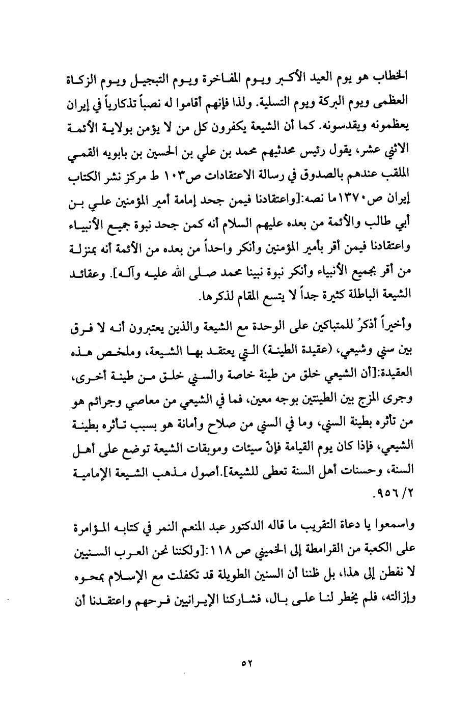 واسمعوا يا دعاة التقريب ما قاله الدكتور عبد المنعم النمر في كتابه المؤامرة على الكعبة من القرامطة إلى الخميني ص 118: [ولكننا نحن العرب السنيين لا نفطن إلى هذا، بل ظننا أن السنين الطويلة قد تكفلت مع الإسلام بمحوه وإزالته، فلم يخطر لنا على بال، فشاركنا الإيرانيين فرحهم واعتقدنا أن