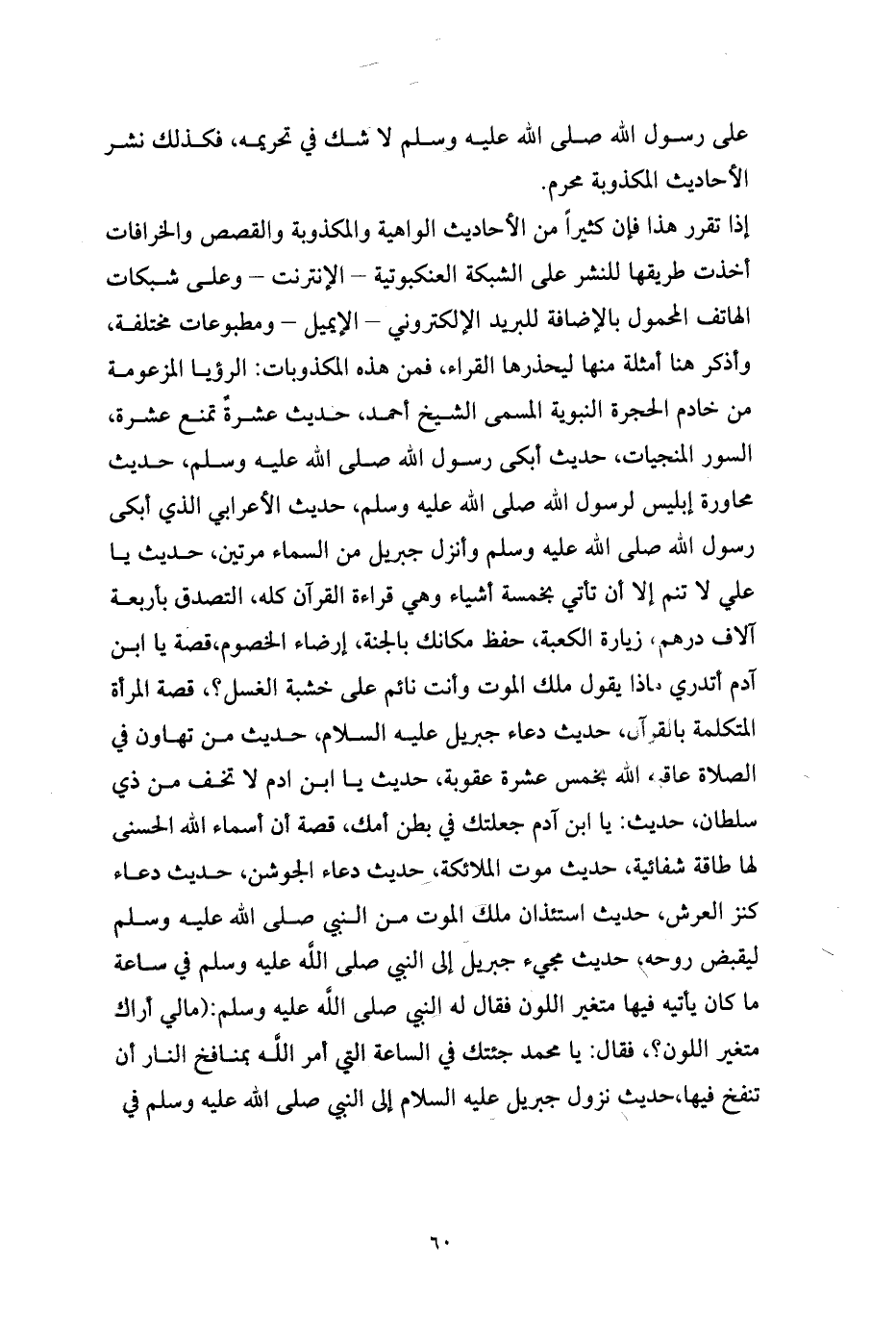 إذا تقرر هذا فإن كثيراً من الأحاديث الواهية والمكذوبة والقصص والخرافات أخذت طريقها للنشر على الشبكة العنكبوتية - الإنترنت - وعلى شبكات الهاتف المحمول بالإضافة للبريد الإلكتروني - الإيميل - ومطبوعات مختلفة، وأذكر هنا أمثلة منها ليحذرها القراء، فمن هذه المكذوبات: الرؤيا المزعومة من خادم الحجرة النبوية المسمى الشيخ أحمد، حديث عشرةٌ تمنع عشرة، السور المنجيات، حديث أبكى رسول الله صلى الله عليه وسلم، حديث محاورة إبليس لرسول الله صلى الله عليه وسلم، حديث الأعرابي الذي أبكى رسول الله صلى الله عليه وسلم وأنزل جبريل من السماء مرتين، حديث يا علي لا تنم إلا أن تأتي بخمسة أشياء وهي قراءة القرآن كله، التصدق بأربعة آلاف درهم، زيارة الكعبة، حفظ مكانك بالجنة، إرضاء الخصوم، قصة يا ابن آدم أتدري ماذا يقول ملك الموت وأنت نائم على خشبة الغسل؟، قصة المرأة المتكلمة بالقرآن، حديث دعاء جبريل عليه السلام، حديث من تهاون في الصلاة عاقبه الله بخمس عشرة عقوبة، حديث يا ابن ادم لا تخف من ذي سلطان، حديث: يا ابن آدم جعلتك في بطن أمك، قصة أن أسماء الله الحسنى لها طاقة شفائية، حديث موت الملائكة، حديث دعاء الجوشن، حديث دعاء كنز العرش، حديث استئذان ملك الموت من النبي صلى الله عليه وسلم ليقبض روحه، حديث مجيء جبريل إلى النبي صلى اللَّه عليه وسلم في ساعة ما كان يأتيه فيها متغير اللون فقال له النبي صلى اللَّه عليه وسلم: (مالي أراك متغير اللون؟، فقال: يا محمد جئتك في الساعة التي أمر اللَّه بمنافخ النار أن تنفخ فيها، حديث نزول جبريل عليه السلام إلى النبي صلى الله عليه وسلم في