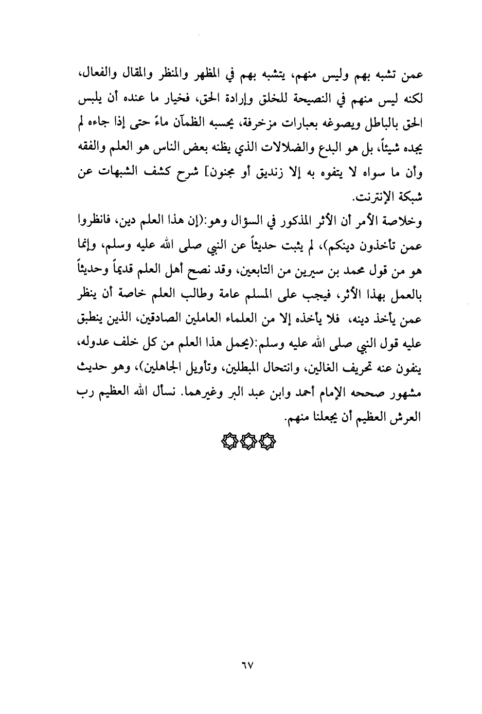عمن تشبه بهم وليس منهم، يتشبه بهم في المظهر والمنظر والمقال والفعال، لكنه ليس منهم في النصيحة للخلق وإرادة الحق، فخيار ما عنده أن يلبس الحق بالباطل ويصوغه بعبارات مزخرفة، يحسبه الظمآن ماءً حتى إذا جاءه لم يجده شيئاً، بل هو البدع والضلالات الذي يظنه بعض الناس هو العلم والفقه وأن ما سواه لا يتفوه به إلا زنديق أو مجنون] شرح كشف الشبهات عن شبكة الإنترنت.