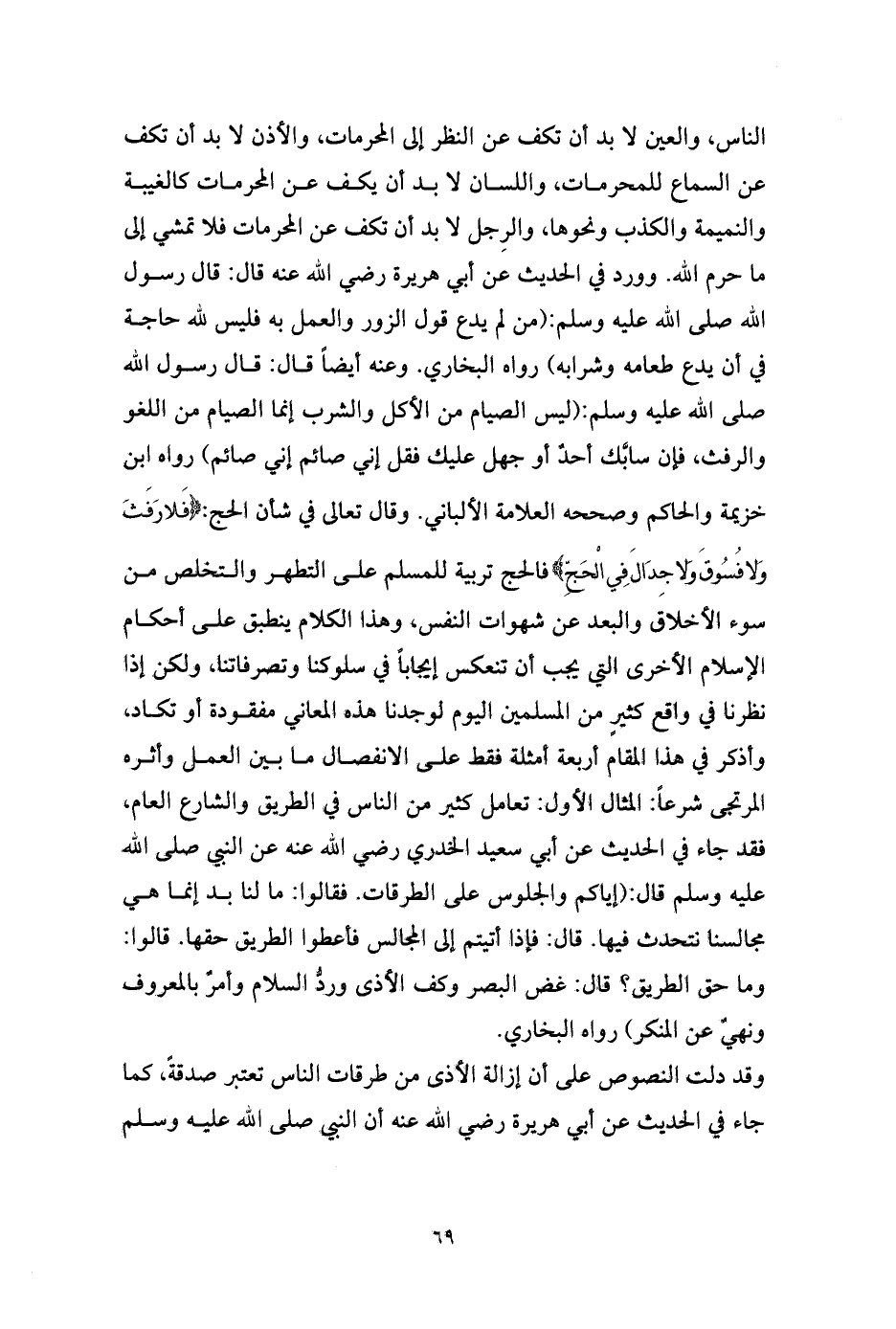 الأكل والشرب إنما الصيام من اللغو والرفث، فإن سابَّك أحدٌ أو جهل عليك فقل إني صائم إني صائم) رواه ابن خزيمة والحاكم وصححه العلامة الألباني. وقال تعالى في شأن الحج: {فَلا رَفَثَ وَلا فُسُوقَ وَلا جِدَالَ فِي الْحَجِّ} فالحج تربية للمسلم على التطهر والتخلص من سوء الأخلاق والبعد عن شهوات النفس، وهذا الكلام ينطبق على أحكام الإسلام الأخرى التي يجب أن تنعكس إيجاباً في سلوكنا وتصرفاتنا، ولكن إذا نظرنا في واقع كثيرٍ من المسلمين اليوم لوجدنا هذه المعاني مفقودة أو تكاد، وأذكر في هذا المقام أربعة أمثلة فقط على الانفصال ما بين العمل وأثره المرتجى شرعاً: المثال الأول: تعامل كثير من الناس في الطريق والشارع العام، فقد جاء في الحديث عن أبي سعيد الخدري رضي الله عنه عن النبي صلى الله عليه وسلم قال: (إياكم والجلوس على الطرقات. فقالوا: ما لنا بد إنما هي مجالسنا نتحدث فيها. قال: فإذا أتيتم إلى المجالس فأعطوا الطريق حقها. قالوا: وما حق الطريق؟ قال: غض البصر وكف الأذى وردُّ السلام وأمرٌ بالمعروف ونهيٌ عن المنكر) رواه البخاري.
