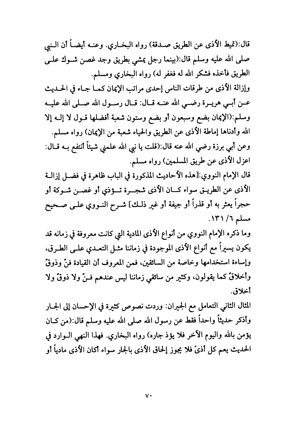 المثال الثاني التعامل مع الجيران: وردت نصوص كثيرة في الإحسان إلى الجار وأذكر حديثاً واحداً فقط عن رسول الله صلى الله عليه وسلم قال: (من كان يؤمن بالله واليوم الآخر فلا يؤذ جاره) رواه البخاري. فهذا النهي الوارد في الحديث يعم كل أذىً فلا يجوز إلحاق الأذى بالجار سواء أكان الأذى مادياً أو