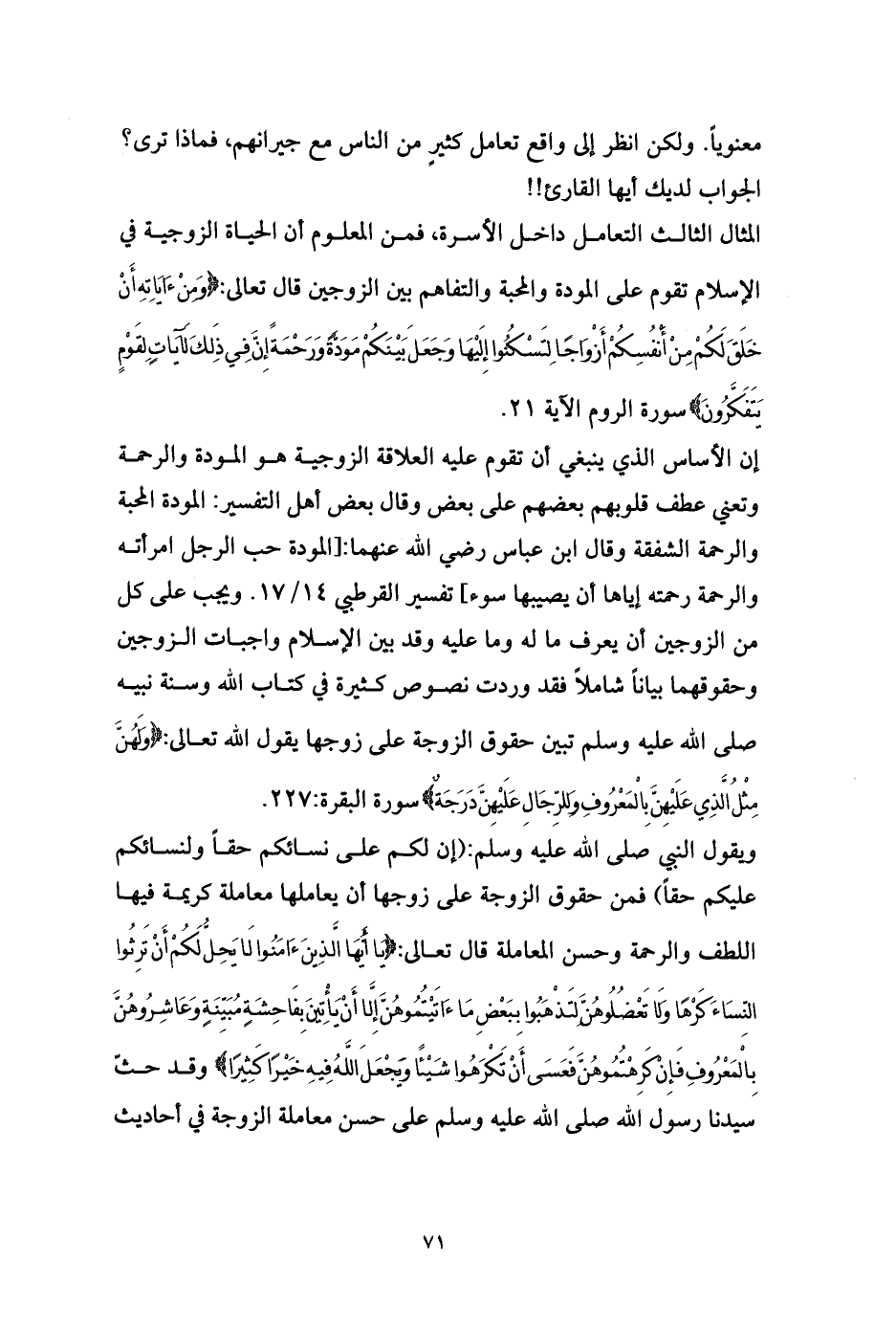 والرحمة وحسن المعاملة قال تعالى: {يَا أَيُّهَا الَّذِينَءَامَنُوا لَا يَحِلُّ لَكُمْ أَنْ تَرِثُوا النِّسَاءَ كَرْهًا وَلَا تَعْضُلُوهُنَّ لِتَذْهَبُوا بِبَعْضِ مَاءَاتَيْتُمُوهُنَّ إِلَّا أَنْ يَأْتِينَ بِفَاحِشَةٍ مُبَيِّنَةٍ وَعَاشِرُوهُنَّ بِالْمَعْرُوفِ فَإِنْ كَرِهْتُمُوهُنَّ فَعَسَى أَنْ تَكْرَهُوا شَيْئًا وَيَجْعَلَ اللَّهُ فِيهِ خَيْرًا كَثِيرًا} وقد حثّ سيدنا رسول الله صلى الله عليه وسلم على حسن معاملة الزوجة في أحاديث