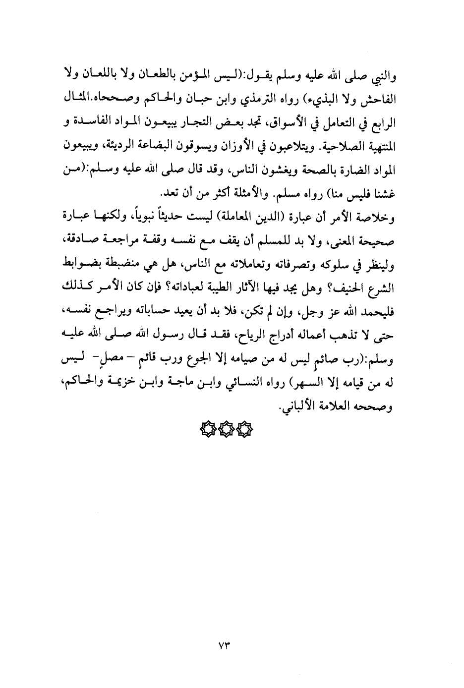 وخلاصة الأمر أن عبارة (الدين المعاملة) ليست حديثاً نبوياً، ولكنها عبارة صحيحة المعنى، ولا بد للمسلم أن يقف مع نفسه وقفة مراجعة صادقة، ولينظر في سلوكه وتصرفاته وتعاملاته مع الناس، هل هي منضبطة بضوابط الشرع الحنيف؟ وهل يجد فيها الآثار الطيبة لعباداته؟ فإن كان الأمر كذلك فليحمد الله عز وجل، وإن لم تكن، فلا بد أن يعيد حساباته ويراجع نفسه، حتى لا تذهب أعماله أدراج الرياح، فقد قال رسول الله صلى الله عليه وسلم: (رب صائمٍ ليس له من صيامه إلا الجوع ورب قائمٍ - مصلٍ- ليس له من قيامه إلا السهر) رواه النسائي وابن ماجة وابن خزيمة والحاكم، وصححه العلامة الألباني.