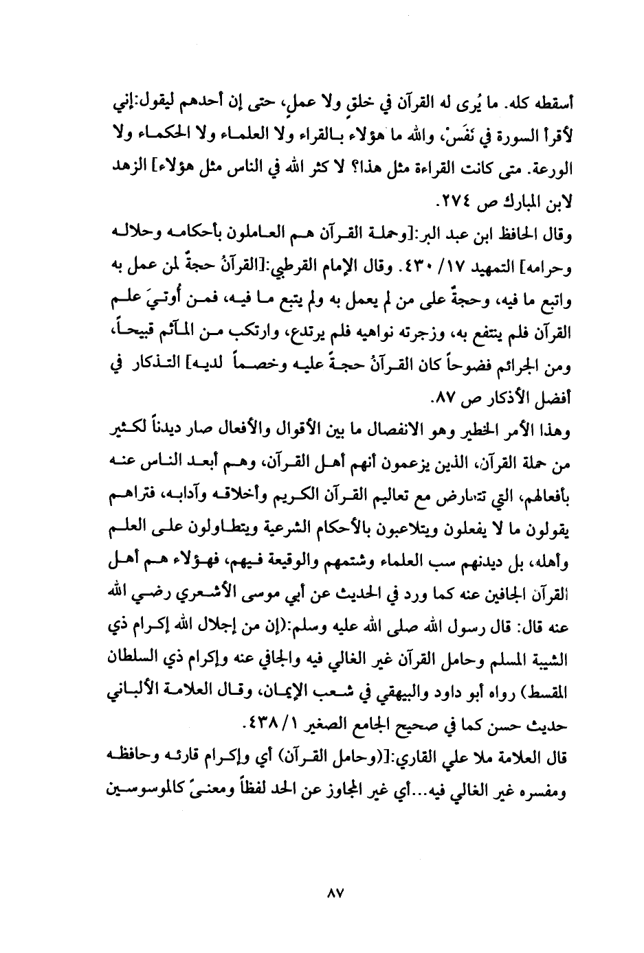 وقال الحافظ ابن عبد البر: [وحملة القرآن هم العاملون بأحكامه وحلاله وحرامه] التمهيد 17/ 430. وقال الإمام القرطبي: [القرآنُ حجةٌ لمن عمل به واتبع ما فيه، وحجةٌ على من لم يعمل به ولم يتبع ما فيه، فمن أُوتيَ علم القرآن فلم ينتفع به، وزجرته نواهيه فلم يرتدع، وارتكب من المآثم قبيحاً، ومن الجرائم فضوحاً كان القرآنُ حجةً عليه وخصماً لديه] التذكار في أفضل الأذكار ص 87.