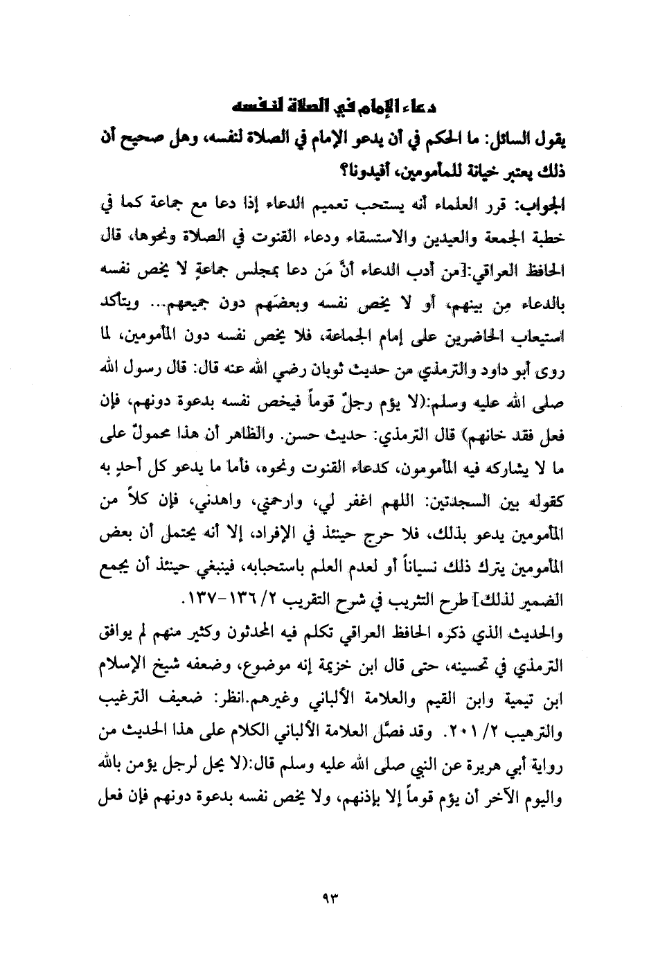 والحديث الذي ذكره الحافظ العراقي تكلم فيه المحدثون وكثير منهم لم يوافق الترمذي في تحسينه، حتى قال ابن خزيمة إنه موضوع، وضعفه شيخ الإسلام ابن تيمية وابن القيم والعلامة الألباني وغيرهم. انظر: ضعيف الترغيب والترهيب 2/ 201. وقد فصَّل العلامة الألباني الكلام على هذا الحديث من رواية أبي هريرة عن النبي صلى الله عليه وسلم قال: (لا يحل لرجل يؤمن بالله واليوم الآخر أن يؤم قوماً إلا بإذنهم، ولا يخص نفسه بدعوة دونهم فإن فعل