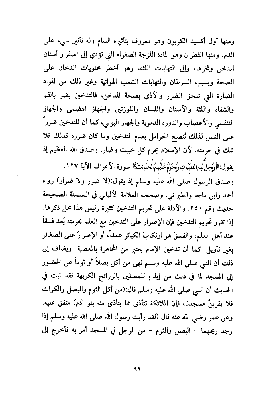 وصدق الرسول صلى الله عليه وسلم إذ يقول: (لا ضرر ولا ضرار) رواه أحمد وابن ماجة والطبراني، وصححه العلامة الألباني في السلسلة الصحيحة حديث رقم 250. والأدلة على تحريم التدخين كثيرة وليس هذا