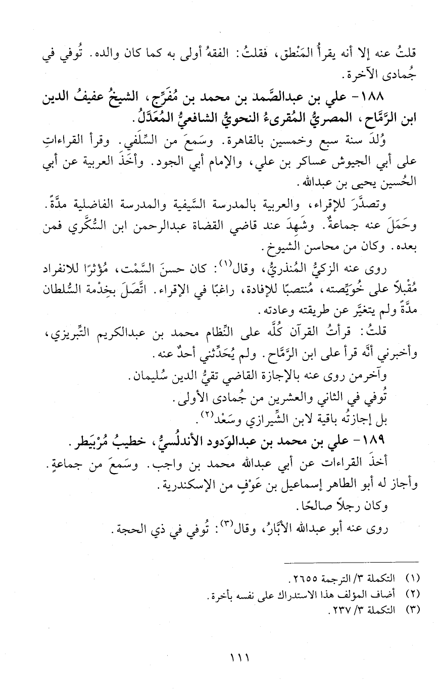 188 - علي بن عبد الصمد بْن مُحَمَّد بْن مفرّج، الشَّيْخ عفيفُ الدّين ابن الرَّمَّاح الْمَصْرِيّ الْمُقْرِئ النَّحْويّ الشّافعيّ المعدَّل. [المتوفى: 633 هـ]