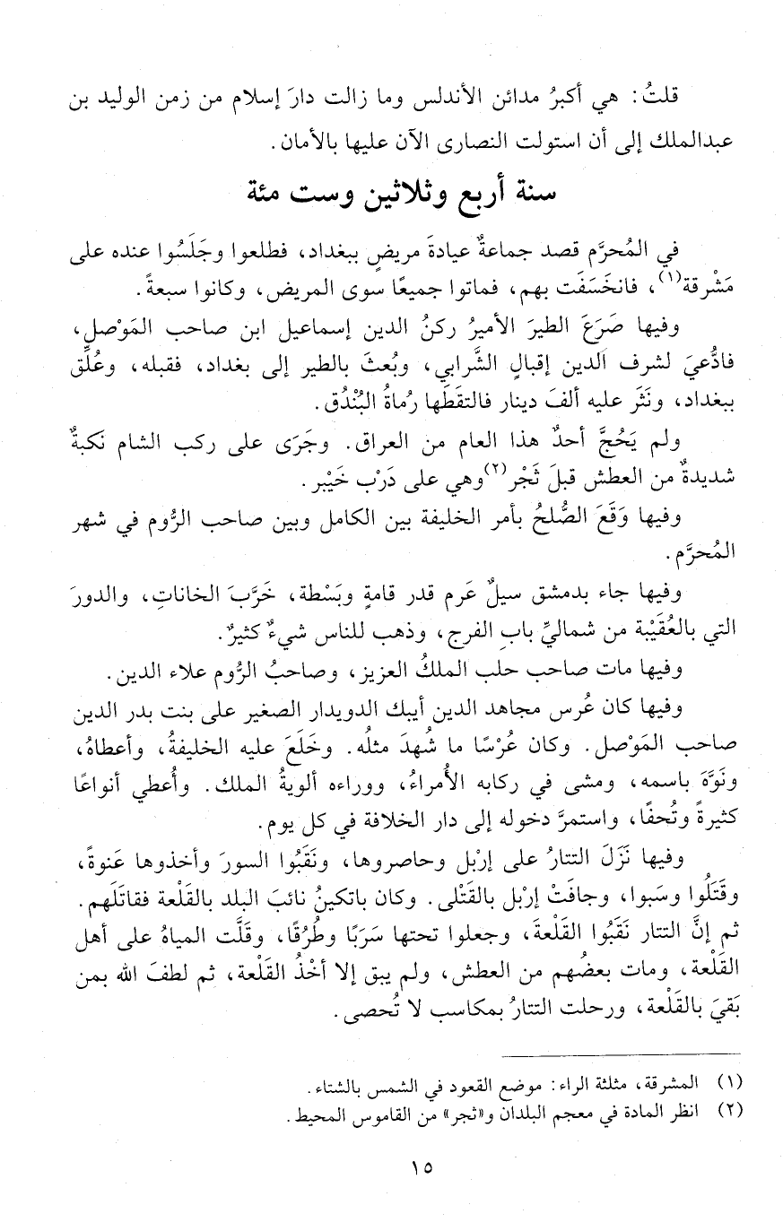 وفيها نَزلَ التتارُ عَلَى إرْبل وحاصروها، ونقبوا السّور وأخذوها عنوةً، وقتلوا وسَبَوْا، وجافَتْ إرْبل بالقتلى. وكان باتكينُ نائبَ البلد بالقلعة فقاتلهم. ثمّ إنَّ التتارَ نقبوا القلعة، وجعلوا تحتها سَرَبًا وطُرُقًا، وقلَّت المياهُ عَلَى أهلِ القلعة، وماتَ بعضهم من العطش، ولم يبقَ إلّا أخذُ القلعة، ثمّ لطفَ اللَّه بمن بَقِيَ بالقلعة، ورحلت التتار بمكاسب لا تحصى. -[16]-