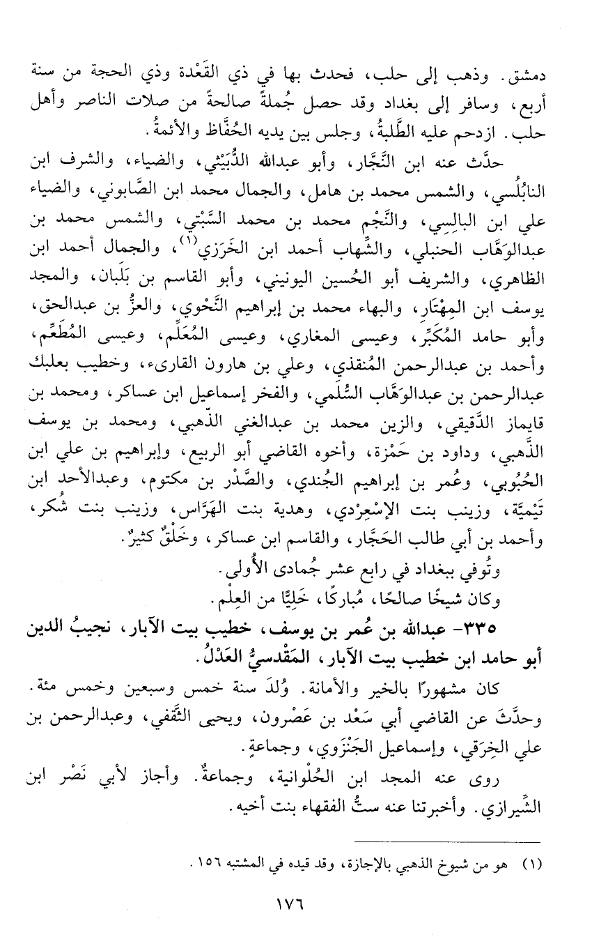 335 - عَبْد اللَّه بْن عُمَر بْن يُوسُف، خطيبُ بيت الآبارِ، نجيبُ الدّين أَبُو حامدٍ ابن خطيب بيت الآبار المقَدْسيُّ العَدْلُ. [المتوفى: 635 هـ]