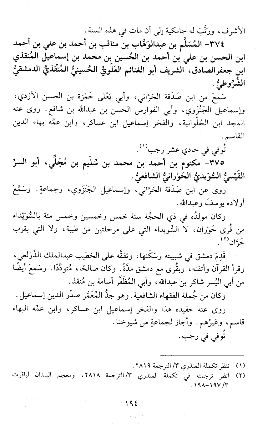 374 - المُسْلِمُ بْن عَبْد الوهَّاب بْن مناقب بْن أَحْمَد بْن عَلِيّ بْن أَحْمَد بْن الْحَسَن بْن عليّ بْن أَحْمَد بْن الْحُسَيْن بْن مُحَمَّد بْن إِسْمَاعِيل المُنقذيّ بْن جعْفَر الصادق، الشريفُ أَبُو الغنائم العَلَويّ، الحسيني المنقذي الدمشقيُّ الشُّروطيُّ. [المتوفى: 635 هـ]