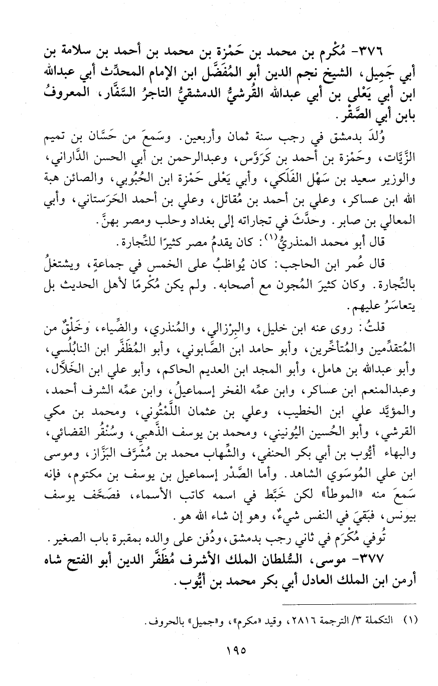 376 - مَكْرَم بْن مُحَمَّد بْن حمزة بْن مُحَمَّد بْن أَحْمَد بْن سلامة بْن أَبِي جميل، الشيخُ نجمُ الدّين أَبُو المفضَّل ابْن الْإمَام المُحَدِّثُ أَبِي عَبْد اللَّه بْن أَبِي يَعْلَى بْن أَبِي عَبْد اللَّه الْقُرَشِيّ الدمشقيُّ التاجرُ السفار، المعروفُ بابن أَبِي الصقْر. [المتوفى: 635 هـ]