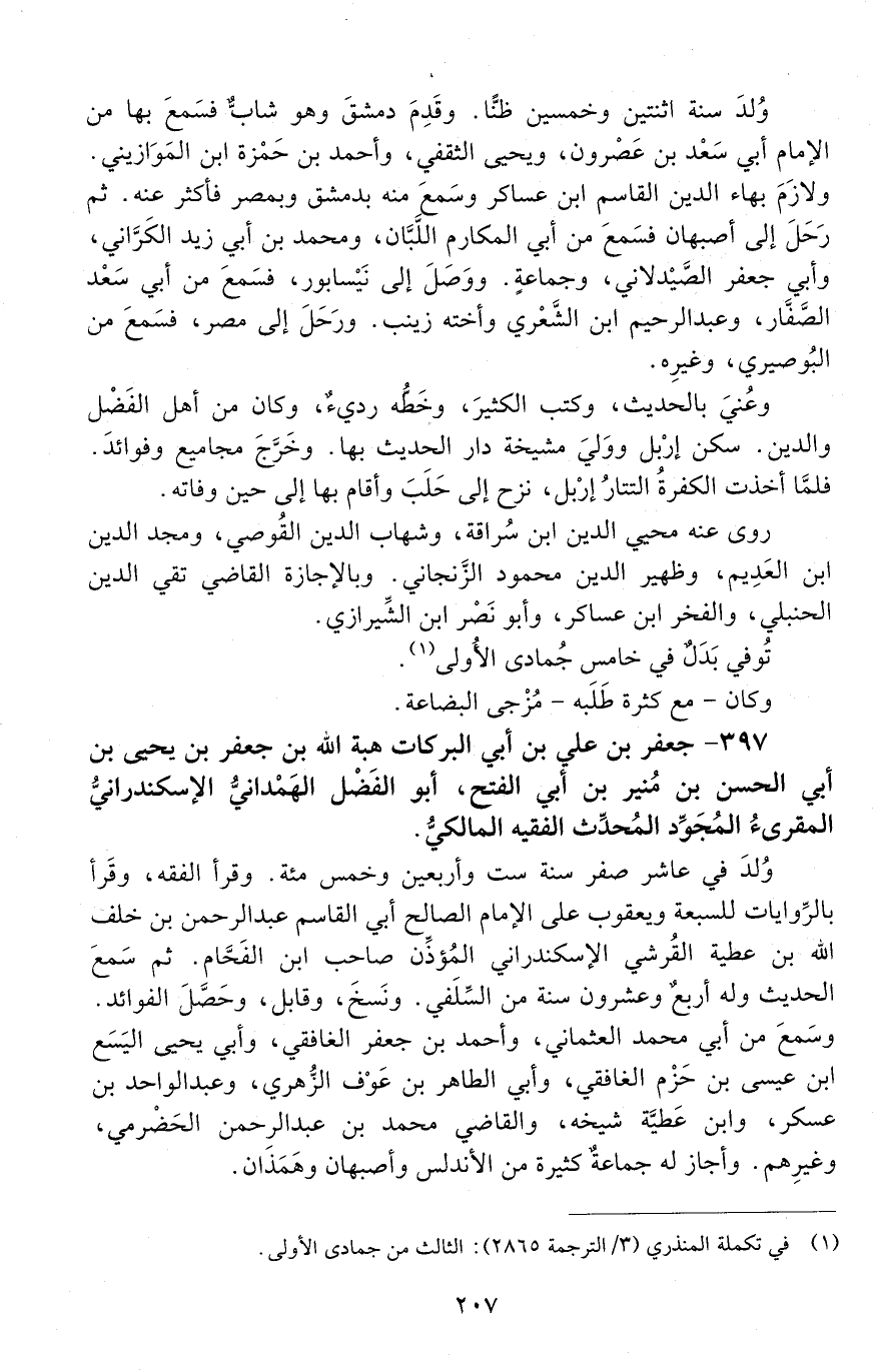 397 - جعْفَر بْن عَلِيّ بْن أَبِي البركات هبة اللَّه بْن جعْفَر بْن يحيى بْن أَبِي الْحَسَن بْن مُنير بْن أَبِي الفتح، أَبُو الفضل الهَمَدانيّ الإسكندراني المُقرئ المُجَوِّدُ المُحَدِّثُ الفقيهُ المالكيّ. [المتوفى: 636 هـ]