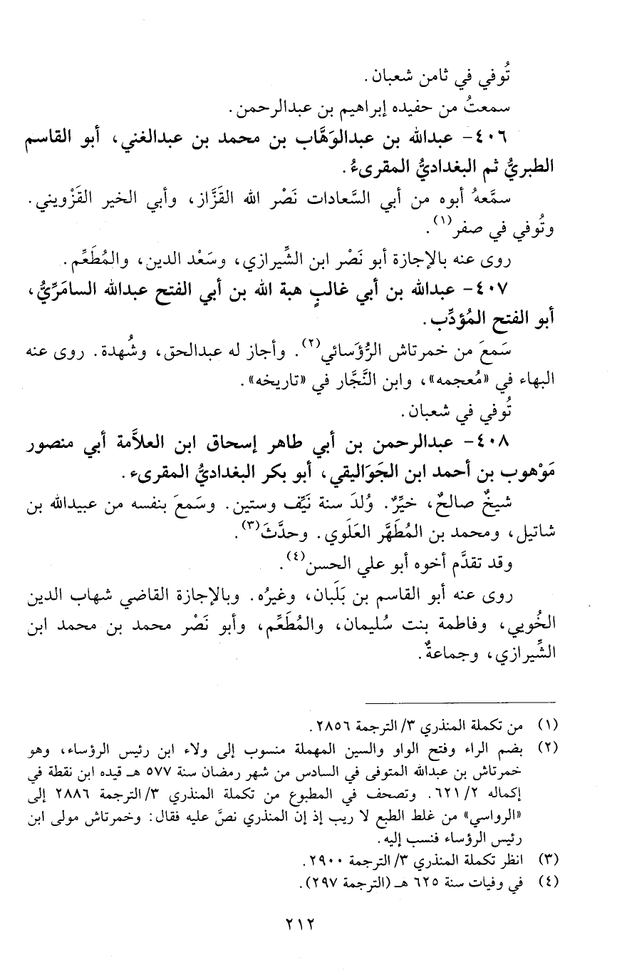 406 - عَبْد اللَّه بْن عبد الوهاب بن محمد بن عبد الغني، أَبُو القاسم الطَّبَريّ ثمّ البغداديّ المُقرئ. [المتوفى: 636 هـ]