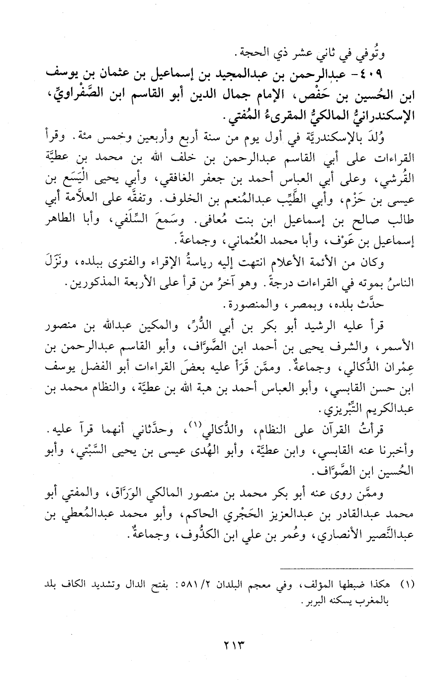 409 - عَبْد الرَّحْمَن بْن عَبْد المجيد بْن إِسْمَاعِيل بْن عثمان بْن يوسف بْن الْحُسَيْن بْن حفص، الإمام جمال الدين أبو القاسم ابن الصفراويّ، الإسكندرانيُّ المالكيُّ المُقرئ المفتي. [المتوفى: 636 هـ]