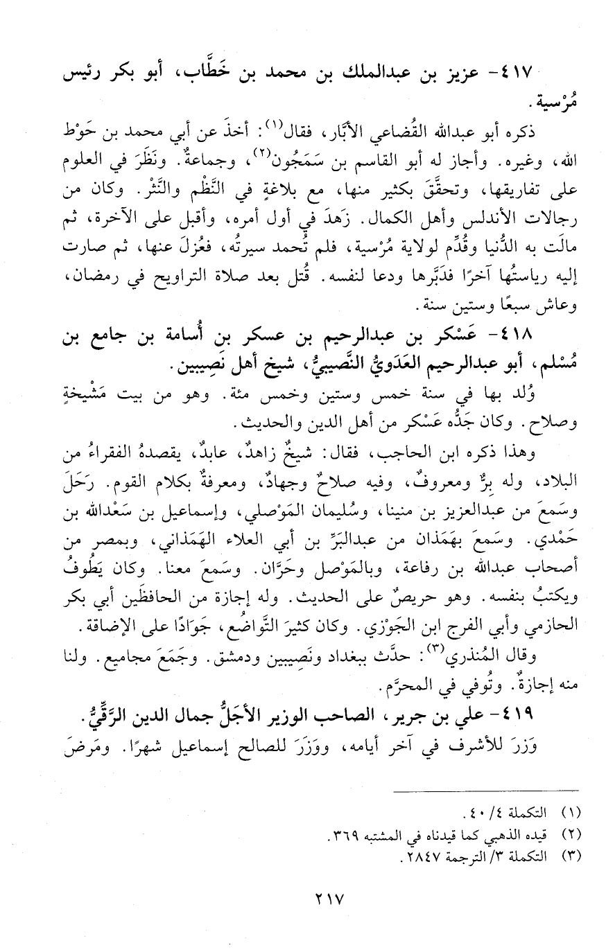 418 - عَسْكُر بن عَبْد الرحيم بن عسكر بن أُسامة بنِ جامع بن مُسلْمِ، أَبُو عَبْد الرحيم العَدَويُّ النَّصيبيُّ. شيخُ أهلِ نَصِيبين. [المتوفى: 636 هـ]