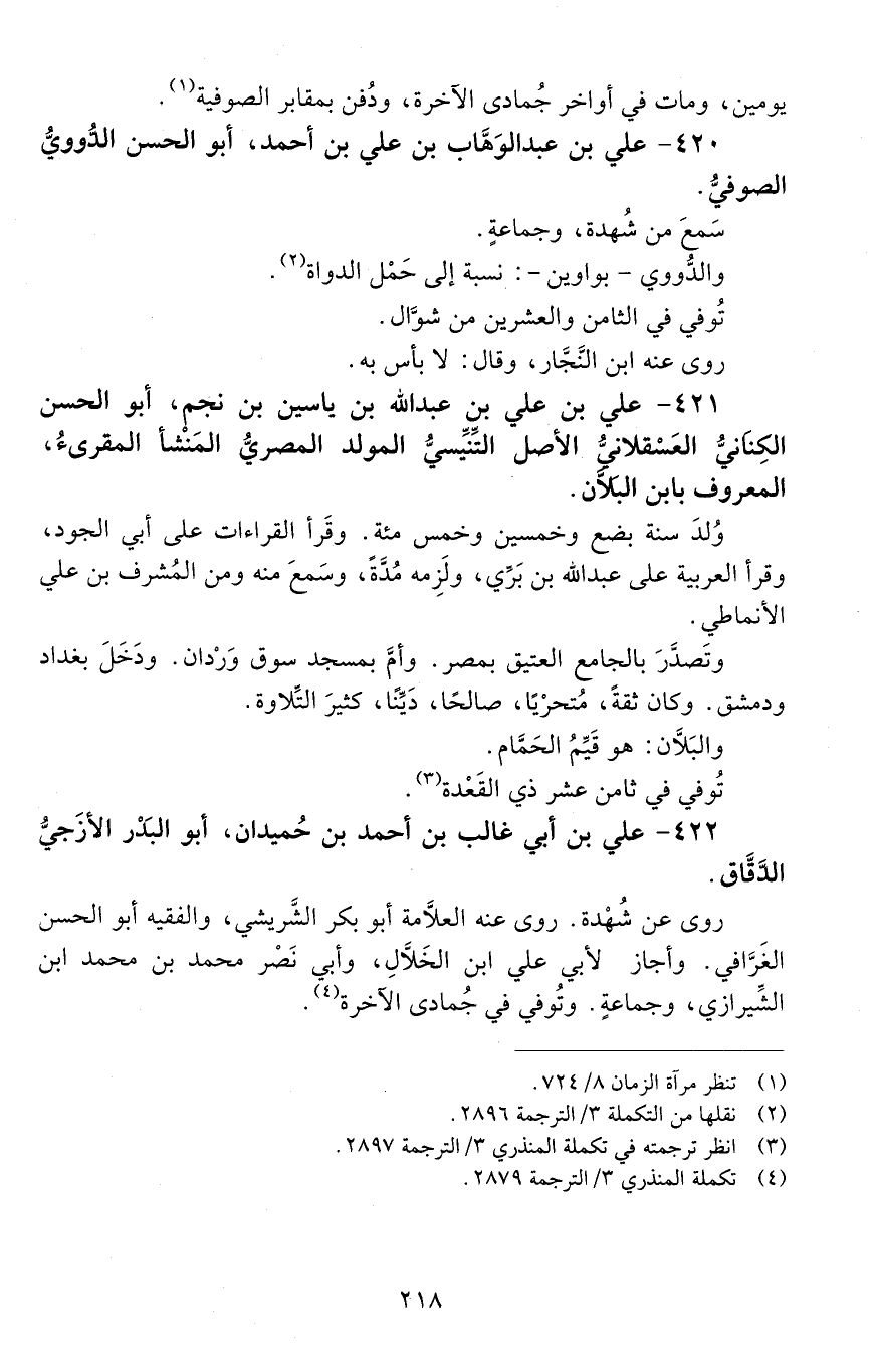 421 - عَلِيّ بْن عَلِيّ بْن عَبْد اللَّه بْن ياسين بن نجم، أَبُو الْحَسَن الكناني العَسْقلانيّ الأصلِ التِّنِّيسيّ المولد الْمَصْريّ المنَشْأ المُقرئ، المعروفُ بابن البلَّان. [المتوفى: 636 هـ]