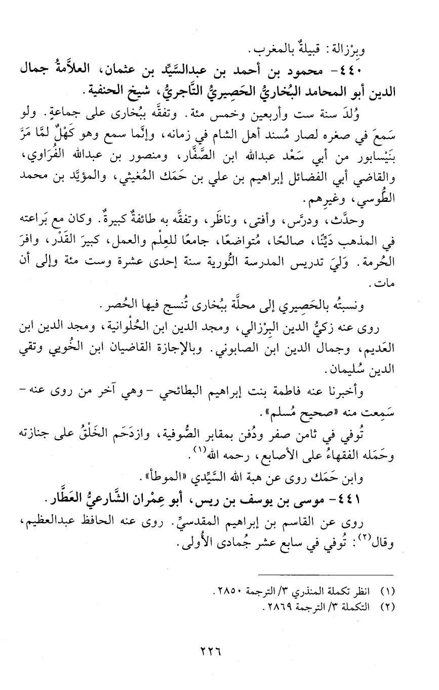 440 - محمود بن أَحْمَد بن عَبْد السيِّد بن عثمانَ، العلّامةُ جمالُ الدّين أَبُو المحامِد الْبُخَارِيّ الحَصِيريّ التاجريّ. [المتوفى: 636 هـ]