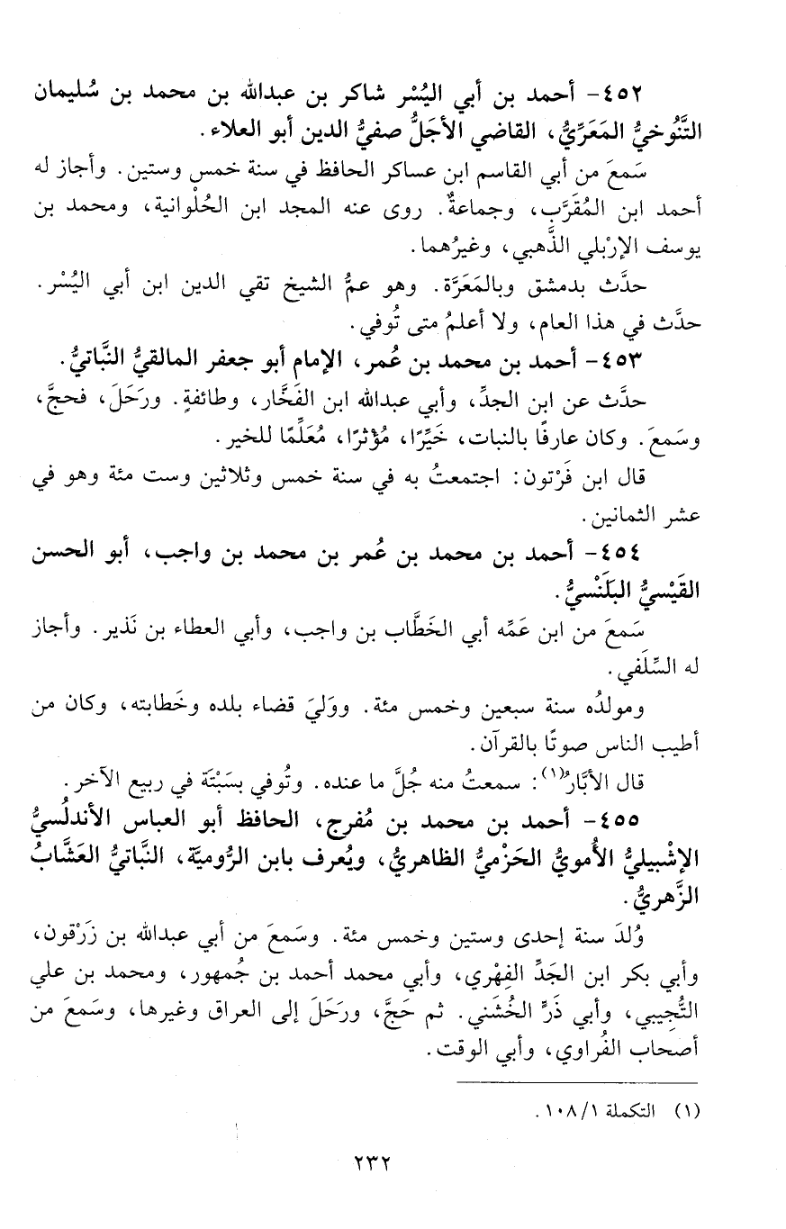 452 - أَحْمَد بن أَبِي اليُسْر شاكر بْن عَبْد اللَّه بْن مُحَمَّد بْن سُلَيْمَان التَّنوخي المَعَرِّي، القاضي الأجلُّ صفيُّ الدّين أَبُو العلاء. [المتوفى: 637 هـ]