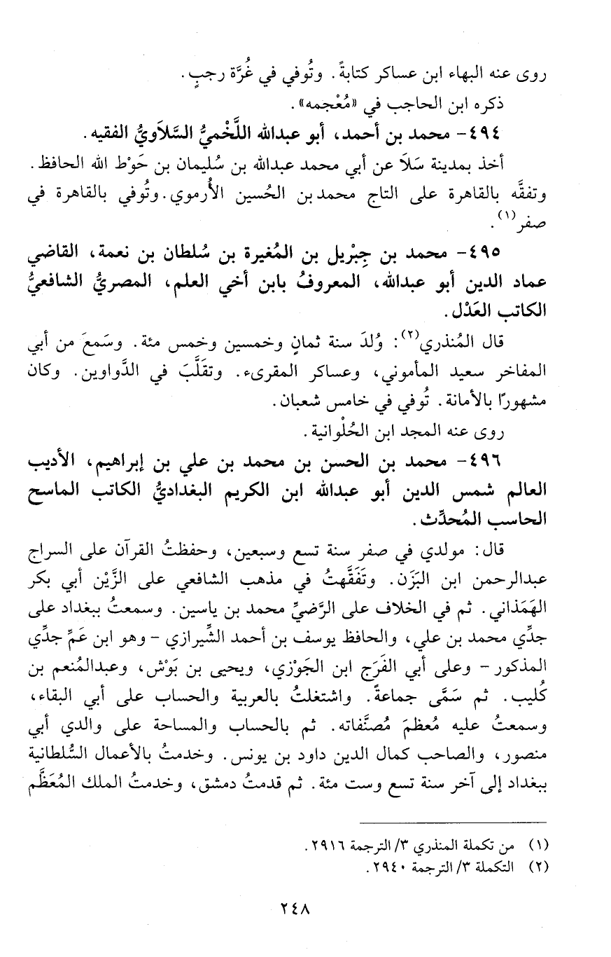 496 - مُحَمَّد بْن الْحَسَن بْن مُحَمَّد بْن عَلِيّ بن إِبْرَاهِيم الأديبُ. العالمُ شمسُ الدّين أبو عبد الله ابن الكريم البغداديّ الكاتبُ الماسحُ الحاسبُ المُحَدِّثُ. [المتوفى: 637 هـ]