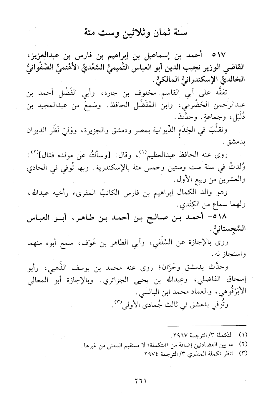 517 - أَحْمَد بْن إِسْمَاعِيل بْن إِبْرَاهِيم بْن فارس بن عَبْد العزيز، القاضي، الوزيرُ، نجيبُ الدّين، أَبُو الْعَبَّاس، التَّميميُّ، السَّعْديّ، الأهْتَمِيّ، الصَّفْوانيّ، الخالديُّ، الإسكندرانيُّ، المالكيّ. [المتوفى: 638 هـ]