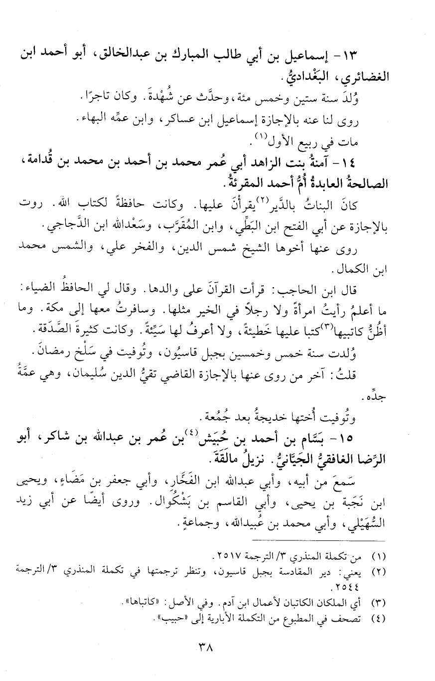 14 - آمنةُ بنتُ الزَّاهد أَبِي عُمَر مُحَمَّد بْن أَحْمَد بْن مُحَمَّد بْن قُدامة، الصالحةُ العابدةُ أمُّ أَحْمَد المقرئةُ. [المتوفى: 631 هـ]