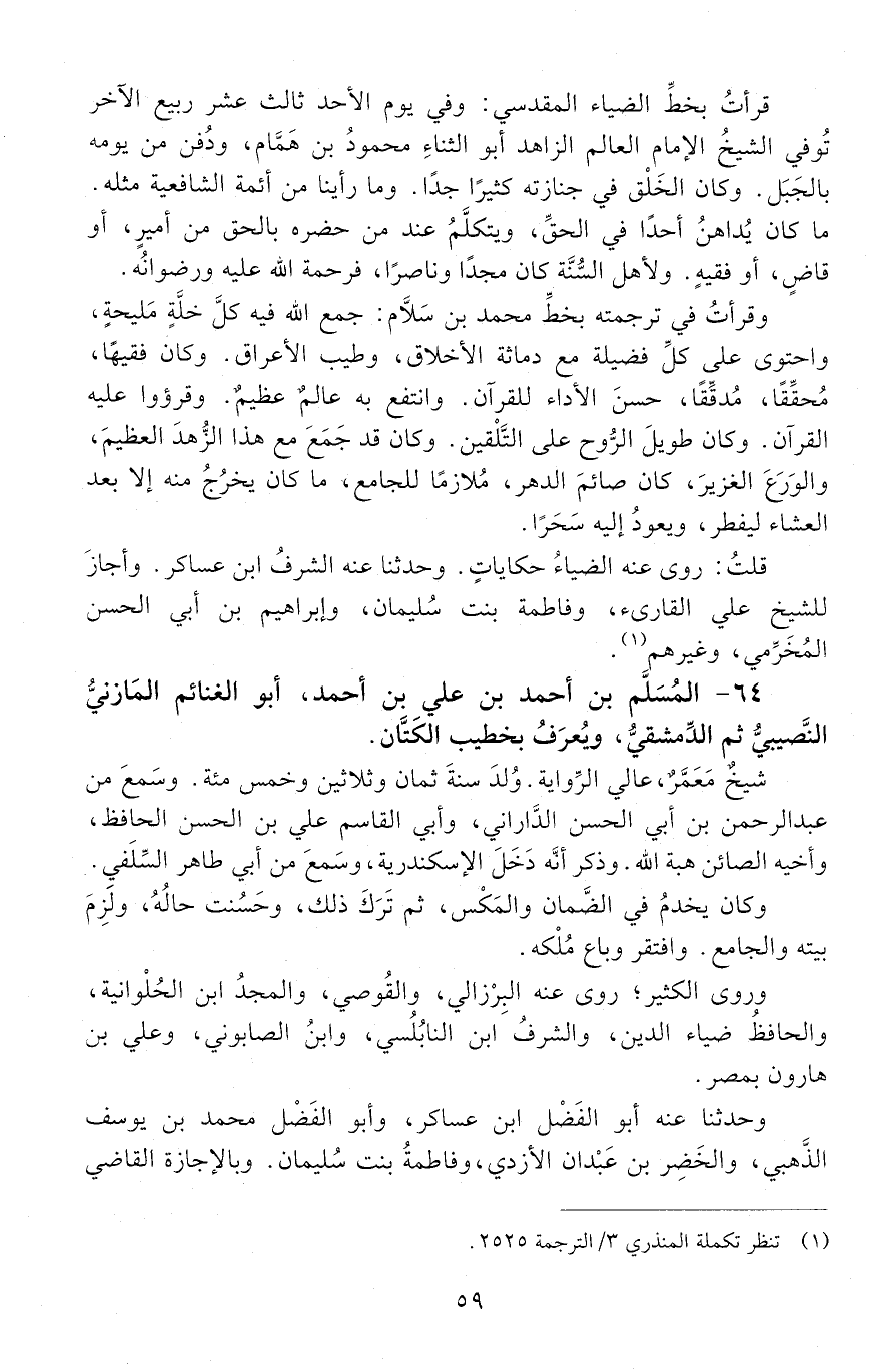 64 - المُسَلَّم بْن أَحْمَد بْن عَلِيّ بْن أَحْمَد، أَبُو الغنائم المازنيُّ النصيبيّ ثمّ الدّمشقيّ، ويعرفُ بخطيب الكَتّانِ. [المتوفى: 631 هـ]