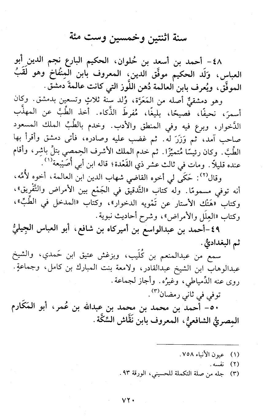 48 - أَحْمَد بن أسعد بن حلوان، الحكيم البارع نجمُ الدين، أَبُو الْعَبَّاس، ولد الحكيم موفَّقُ الدين، المعروف بابن المنفاخ، وهو لَقَبُ الموفَّق. ويُعرف بابن العالِمة دُهْن اللوز التي كانت عالمة دمشق. [المتوفى: 652 هـ]