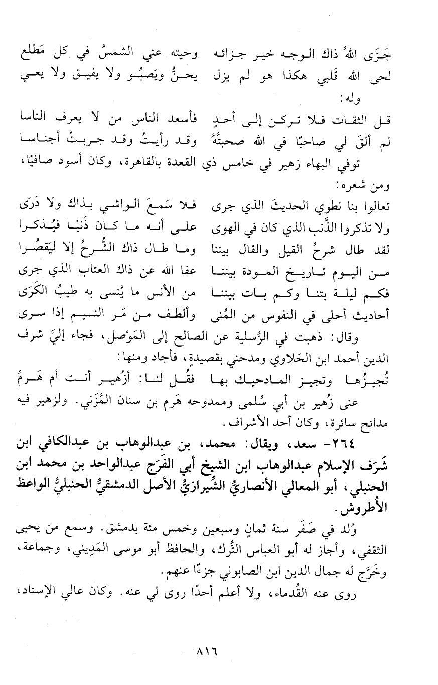 264 - سعد، ويقال: مُحَمَّد، بن عَبْد الوهاب بن عبد الكافي ابن شَرَف الإِسْلَام عَبْد الوَهَّاب ابن الشَّيْخ أَبِي الفَرَج عبد الواحد بن محمد ابن الحنبلي، أَبُو المعالي الأَنْصَارِيّ، الشيرازي الأصل، الدمشقي، الحنبلي، الواعظ، الأطروش. [المتوفى: 656 هـ]