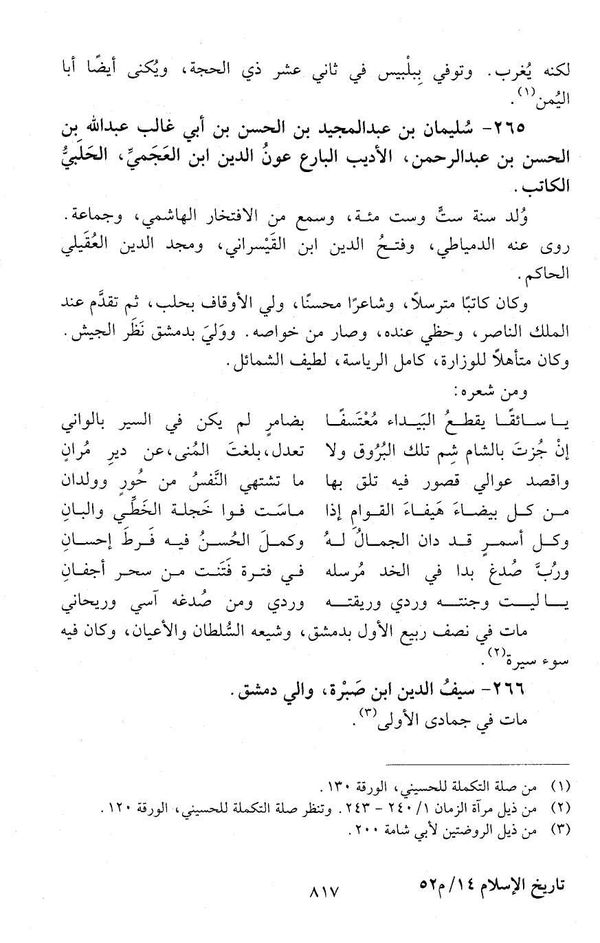 265 - سُلَيْمَان بن عَبْد المجيد بن الْحَسَن بن أَبِي غالب عَبْد الله بن الحسن بن عبد الرحمن، الأديب البارع، عونُ الدين ابن العجمي، الحلبي، الكاتب. [المتوفى: 656 هـ]