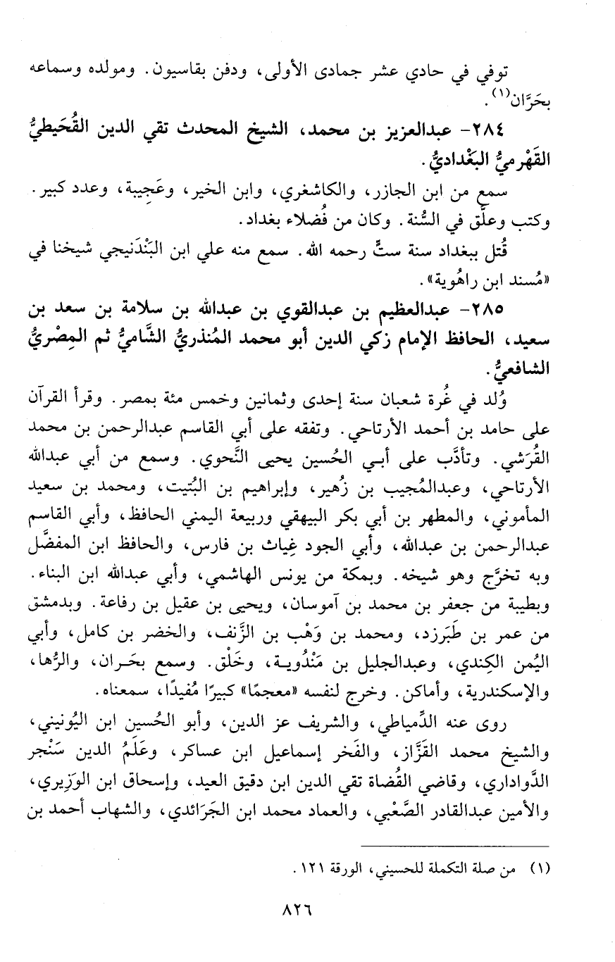 285 - عَبْد العظيم بْن عَبْد القويّ بْن عَبْد اللَّه بْن سلامة بْن سَعْد بْن سَعِيد، الحافظ الإمام، زكي الدين، أبُو محمد المُنْذِري، الشّامي، ثمّ الْمَصْرِيّ، الشّافعيّ. [المتوفى: 656 هـ]