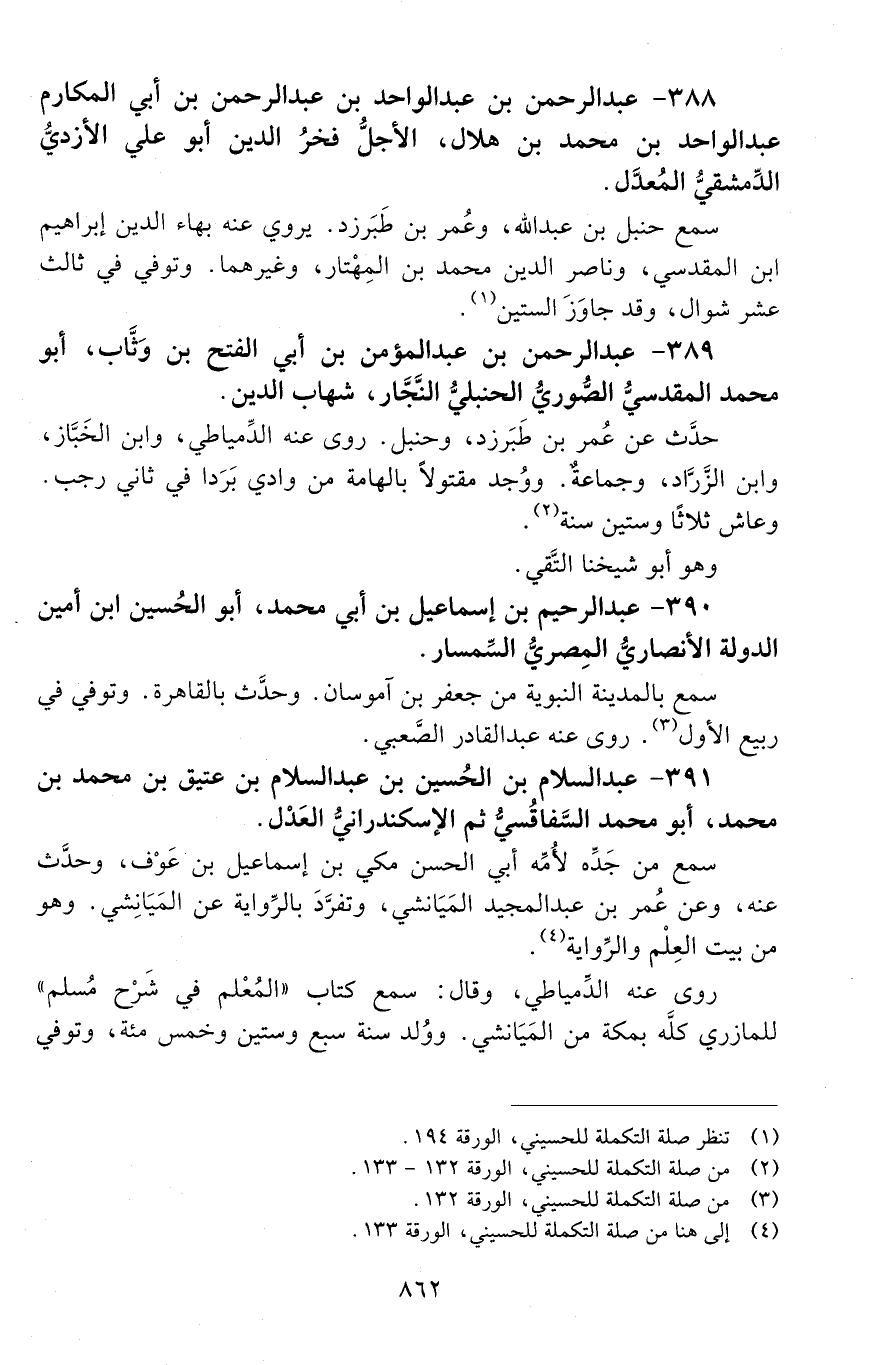 388 - عَبْد الرَّحْمَن بْن عَبْد الواحد بْن عَبْد الرحمن بن أبي المكارم عَبْد الواحد بْن مُحَمَّد بْن هلال، الأجل، فخرُ الدين، أبو عليّ الأزْديّ، الدّمشقيّ، المعدل. [المتوفى: 657 هـ]