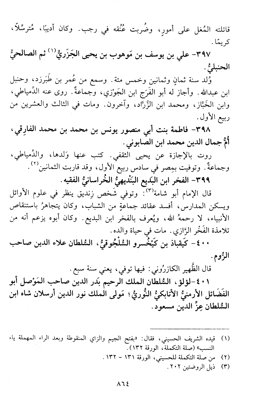 397 - عليّ بْن يوسف بْن موهوب بْن يحيى الجَزَريّ، ثُمَّ الصالحي، الحَنْبليّ. [المتوفى: 657 هـ]