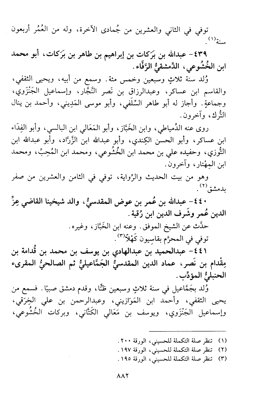 439 - عَبْد الله بنُ بركات بْن إِبْرَاهِيم بْن طاهر بْن بركات، أبو محمد ابن الخُشُوعيّ، الدّمشقيّ، الرّفّاء. [المتوفى: 658 هـ]