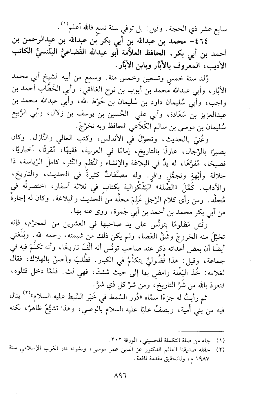 464 - مُحَمَّد بْن عَبْد اللَّه بْن أَبِي بَكْرِ بْنِ عَبْد اللَّه بْن عَبْد الرَّحْمَن بْن أَحْمَد بْن أبي بَكْر، الحافظ العلّامة أبُو عَبْد الله القضاعي، البلنسي الكاتب الأديب، المعروف بالأبار وبابن الأبار. [المتوفى: 658 هـ]