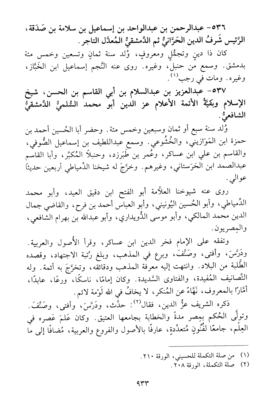 536 - عَبْد الرَّحْمَن بْن عَبْد الواحد بْن إِسْمَاعِيل بْن سلامة بْن صَدَقة، الرئيس شَرَفُ الدين الحراني، ثُمَّ الدّمشقيّ، المعدل، التّاجر. [المتوفى: 660 هـ]