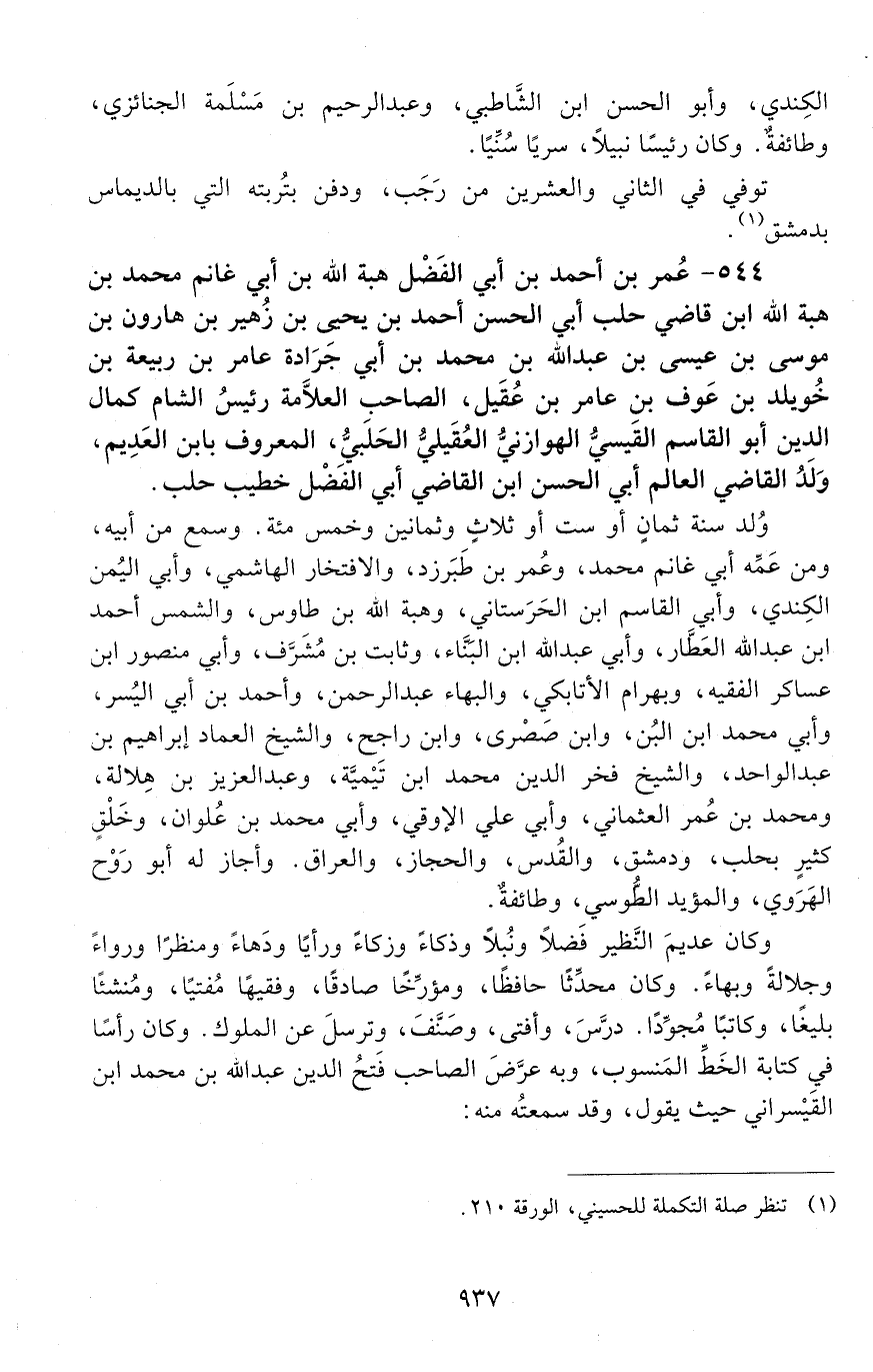 544 - عُمَر بْن أحمد بْن أبي الفَضْلِ هبة الله بْن أبي غانم محمد بن هبة الله ابن قاضي حلب أبي الحَسَن أحمد بْن يحيى بْن زهير بْن هارون بْن موسى بْن عِيسَى بْن عَبْد اللَّه بْن مُحَمَّد بْن أَبِي جرادة عامر بْن ربيعة بْن خُوَيْلد بْن عَوْف بْن عامر بْن عقيل، الصاحب العلّامة رئيس الشام كمال الدّين أبو القاسم القَيْسي، الهوازني، العُقَيْليّ، الحلبي، المعروف بابن العديم، [المتوفى: 660 هـ]