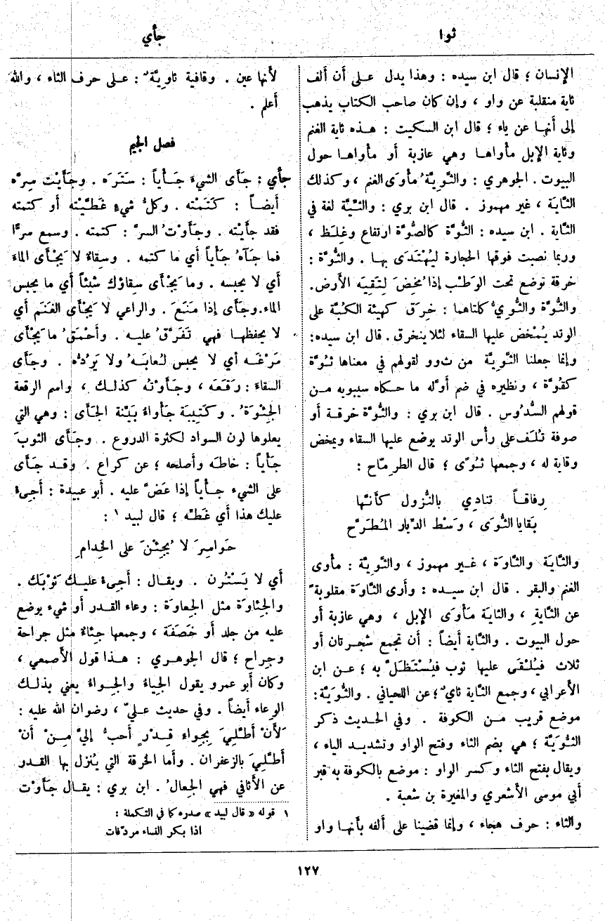 الإِنسان؛ قَالَ ابْنُ سِيدَهْ: وَهَذَا يَدُلُّ عَلَى أَن أَلف ثَايَةَ مُنْقَلِبَةٌ عَنْ وَاوٍ، وَإِنْ كَانَ صَاحِبُ الْكِتَابِ يَذْهَبُ إِلَى أَنها عَنْ يَاءٍ؛ قَالَ ابْنُ السِّكِّيتِ: هَذِهِ ثَايَة الْغَنَمِ وثَايَة الإِبل مأْواها وَهِيَ عَازِبَةٌ أَو مأْواها حَوْلَ الْبُيُوتِ. الْجَوْهَرِيُّ: والثَّوِيَّةُ مأْوَى الْغَنَمِ، وَكَذَلِكَ الثَّايَة، غَيْرُ مَهْمُوزٍ. قَالَ ابْنُ بَرِّيٍّ: والثِّيَّة لُغَةٌ فِي الثَّايَة. ابْنُ سِيدَهْ: الثُّوَّة كالصُّوَّة ارْتِفَاعٌ وغِلَظ، وَرُبَّمَا نُصِبَتْ فَوْقَهَا الْحِجَارَةُ ليُهْتَدَى بِهَا. والثُّوَّة: خِرْقَةٌ تُوضَعُ تَحْتَ الوَطْب إِذَا مُخِضَ لِتَقِيَه الأَرض. والثُّوَّة والثُّوِيُّ كِلْتَاهُمَا: خِرَق كَهَيْئَةِ الكُبَّة عَلَى الْوَتَدِ يُمْخض عَلَيْهَا السِّقَاءُ لِئَلَّا يَنْخَرِقَ. قَالَ ابْنُ سِيدَهْ: وَإِنَّمَا جَعَلْنَا الثَّوِيَّة من ث وو لِقَوْلِهِمْ فِي مَعْنَاهَا ثُوَّة كقُوَّة، وَنَظِيرُهُ فِي ضَمِّ أَوَّله مَا حَكَاهُ سِيبَوَيْهِ مِنْ قَوْلِهِمُ السُّدُوس. قَالَ ابْنُ بَرِّيٍّ: والثُّوَّة خِرْقَةٌ أَو صُوفَةٌ تُلَف عَلَى رأَس الْوَتَدِ يُوضَعُ عَلَيْهَا السِّقَاءُ وَيُمْخَضُ وِقَايَةً لَهُ، وَجَمْعُهَا ثُوىً؛ قَالَ الطرِمّاح: