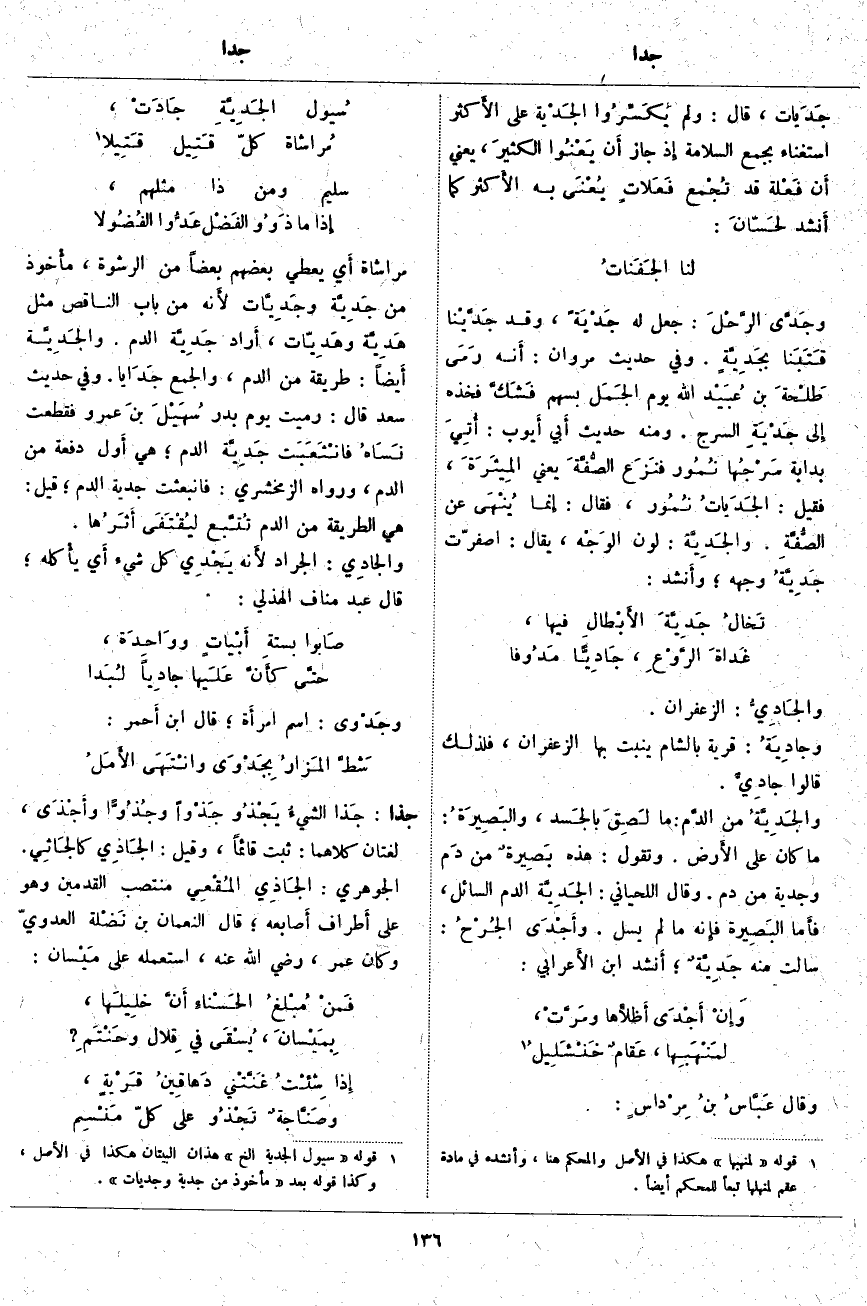 (2). قوله [لمنهبها] هكذا في الأصل والمحكم هنا، وأنشده في مادة عقم لمنهلها تبعاً للمحكم أيضاً (3). قوله [سيول الجَدِيَّة إلخ] هذان البيتان هكذا في الأَصل، وكذا قوله بعد [مَأْخُوذٌ مِنْ جَدِيَّة وجَدِيَّات]