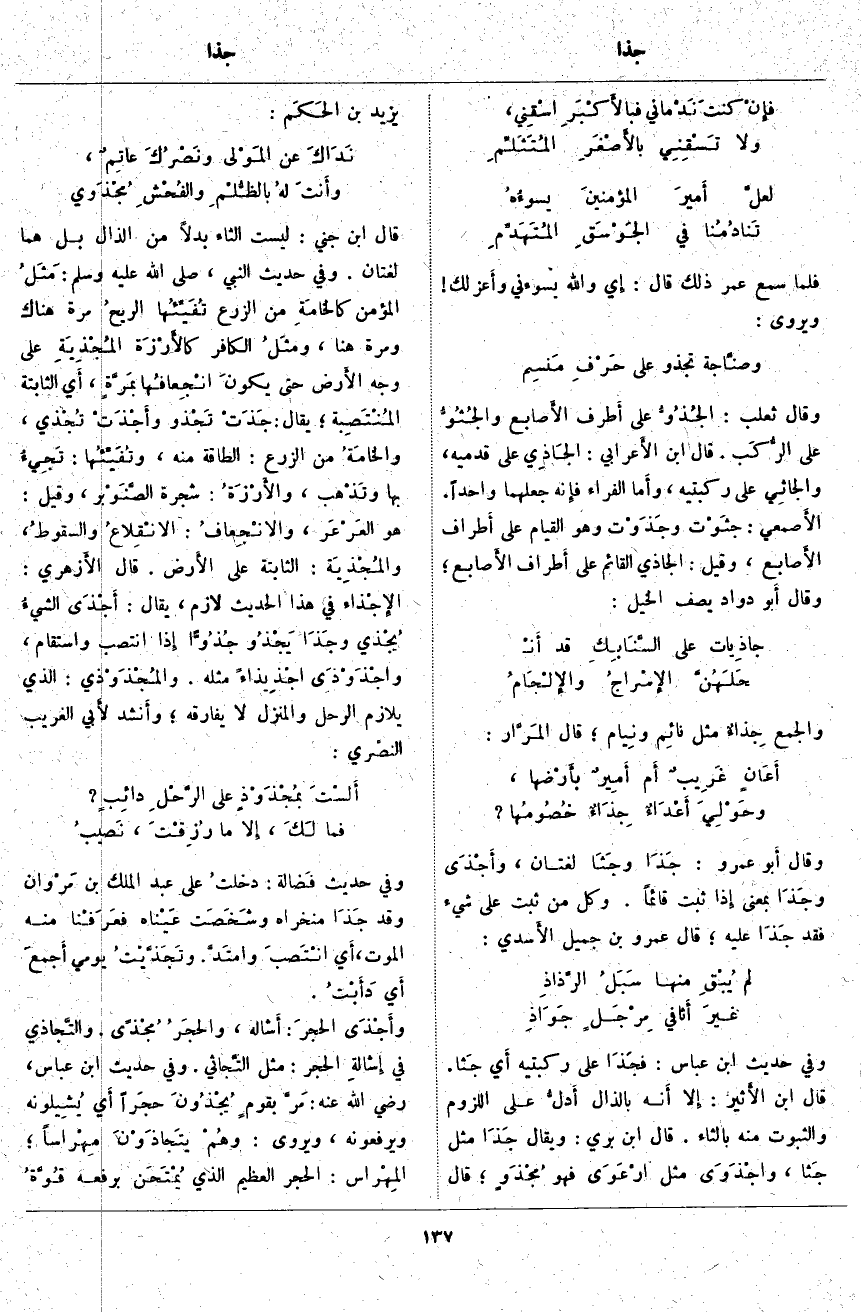 ، أَي الثَّابِتَةُ المُنْتَصِبة؛ يُقَالُ: جَذَتْ تَجْذو وأَجْذَتْ تُجْذي، والخامَةُ مِنَ الزَّرْعِ: الطَّاقَةُ مِنْهُ، وتُفَيِّئُها: تَجِيءُ بِهَا وتَذْهب، والأَرْزَةُ: شَجَرَةُ الصَّنَوْبر، وَقِيلَ: هُوَ العَرْعَر، والانْجِعافُ: الانْقِلاعُ والسقوطُ، والمُجْذِيَة: الثَّابِتَةُ عَلَى الأَرض. قَالَ الأَزهري: الإِجْذاء فِي هَذَا الْحَدِيثِ لَازِمٌ، يُقَالُ: أَجْذَى الشيءُ يُجْذي وجَذَا يَجْذُو جُذُوّاً إِذَا انْتَصَبَ وَاسْتَقَامَ، واجْذَوْذَى اجْذِيذاءً مِثْلُهُ. والمُجْذَوْذِي: الَّذِي يُلَازِمُ الرَّحْلَ وَالْمَنْزِلَ لَا يُفَارِقُهُ؛ وأَنشد لأَبي الْغَرِيبِ النصْري: