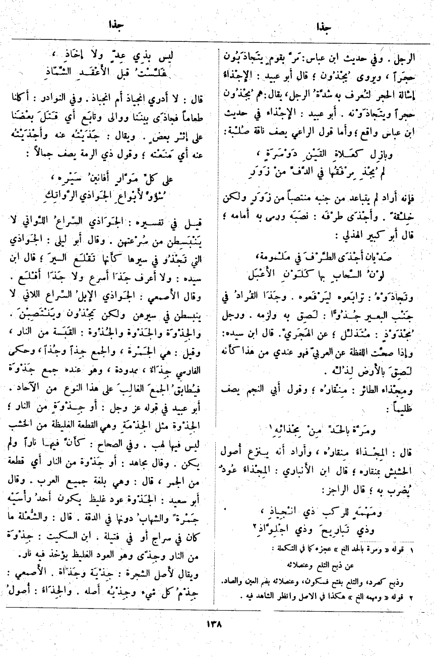 أَي قِطْعَةٌ مِنَ الْجَمْرِ، قَالَ: وَهِيَ بِلُغَةِ جَمِيعِ الْعَرَبِ. وَقَالَ أَبو سَعِيدٍ: الجَذْوَة عُودٌ غَلِيظٌ يَكُونُ أَحدُ رأْسَيْه جَمْرةً والشهابُ دُونَهَا فِي الدِّقَّةِ. قَالَ: والشُّعْلة مَا كَانَ فِي سِرَاجٍ أَوْ فِي فَتِيلَةٍ. ابْنُ السِّكِّيتِ: جِذْوَة مِنَ النَّارِ وجِذًى وَهُوَ الْعُودُ الْغَلِيظُ يُؤْخَذُ فِيهِ نَارٌ. وَيُقَالُ لأَصل الشَّجَرَةِ: جِذْيَة وجَذَاة. الأَصمعي: جِذْمُ كُلِّ شَيْءٍ وجِذْيُه أَصله. والجِذَاءُ: أُصولُ
