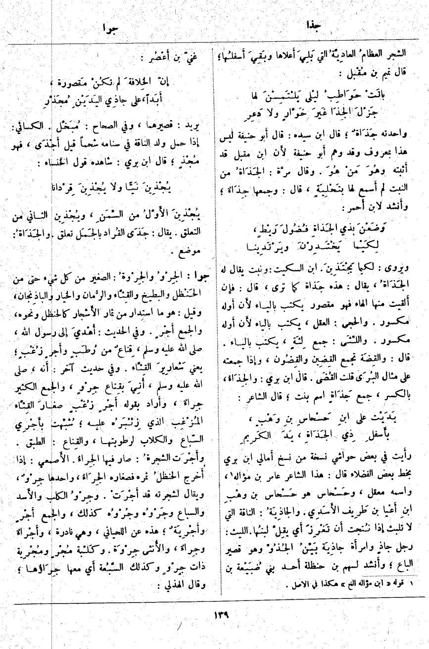 رأَيت فِي بَعْضِ حَوَاشِي نُسْخَةٍ مِنْ نُسَخِ أَمالي ابْنِ بَرِّيٍّ بِخَطِّ بَعْضِ الْفُضَلَاءِ قَالَ: هَذَا الشَّاعِرُ عَامِرُ بْنُ مُؤَالِهٍ «1»، وَاسْمُهُ مَعْقِلٌ، وحَسْحاس هُوَ حَسْحاس بن وهْبِ ابنِ أَعْيا بْنِ طَرِيف الأَسَدِي. والجَاذِيَةُ: النَّاقَةُ الَّتِي لَا تَلْبَثُ إِذَا نُتجت أَن تَغْرِزَ أَي يقِلَّ لبنُها. اللَّيْثُ: رَجُلٌ جاذٍ وامرأَة جَاذِيَة بَيِّنُ الجُذُوِّ وَهُوَ قَصِيرُ الْبَاعِ؛ وأَنشد لِسَهْمِ بْنِ حَنْظَلَةَ أَحد بَنِي ضُبَيْعة بْنِ غَنِيِّ بْنِ أَعْصُر: