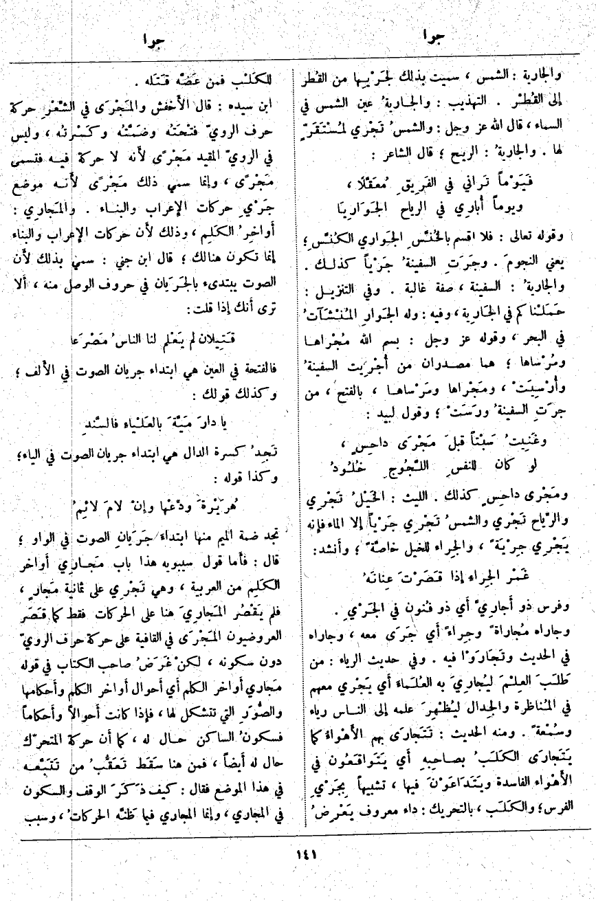أَي يَتَواقَعُون فِي الأَهْواء الْفَاسِدَةِ ويَتَدَاعَوْنَ فِيهَا، تَشْبِيهًا بِجَرْيِ الْفَرَسِ؛ والكَلَب، بِالتَّحْرِيكِ: دَاءٌ مَعْرُوفٌ يَعْرِضُ للكَلْب فَمَنْ عَضَّه قَتَله. ابْنُ سِيدَهْ: قَالَ الأَخفش والمَجْرَى فِي الشِّعْرِ حَرَكَةُ حَرْفِ الرَّوِيِّ فتْحَتُه وضَمَّتُه وكَسْرتُه، وَلَيْسَ فِي الرَّوِيِّ الْمُقَيَّدِ مَجْرىً لأَنه لَا حَرَكَةَ فِيهِ فَتُسَمَّى مَجْرىً، وَإِنَّمَا سُمِّيَ ذَلِكَ مَجْرىً لأَنه مَوْضِعُ جَرْيِ حَرَكَاتِ الإِعراب وَالْبِنَاءِ. والمَجَارِي: أَواخِرُ الكَلِم، وَذَلِكَ لأَن حَرَكَاتِ الإِعراب وَالْبِنَاءِ إِنَّمَا تَكُونُ هُنَالِكَ؛ قَالَ ابْنُ جِنِّي: سُمِّيَ بِذَلِكَ لأَن الصَّوْتَ يَبْتَدِئُ بالجَرَيان فِي حُرُوفِ الْوَصْلِ مِنْهُ، أَلَا تَرَى أَنك إِذَا قُلْتَ: