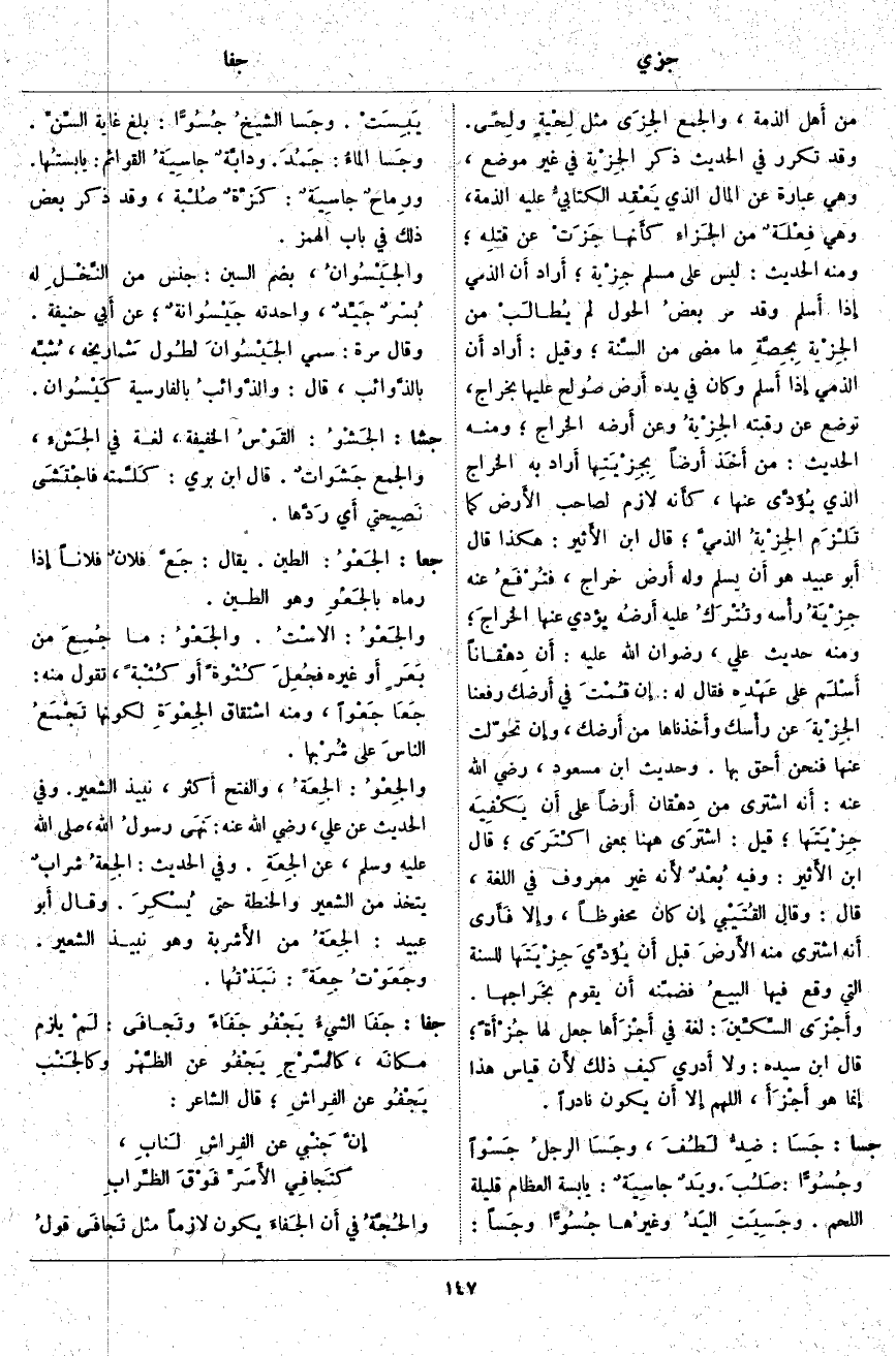 مِنْ أَهل الذِّمَّةِ، وَالْجَمْعُ الجِزَى مِثْلُ لِحْيةٍ ولِحىً. وَقَدْ تَكَرَّرَ فِي الْحَدِيثِ ذِكْرُ الجِزْيَة فِي غَيْرِ مَوْضِعٍ، وَهِيَ عِبَارَةٌ عَنِ الْمَالِ الَّذِي يَعْقِد الكتابيُّ عَلَيْهِ الذِّمَّةَ، وَهِيَ فِعْلَةٌ مِنَ الجَزاء كأَنها جَزَتْ عَنْ قتلِه؛ وَمِنْهُ الْحَدِيثُ: