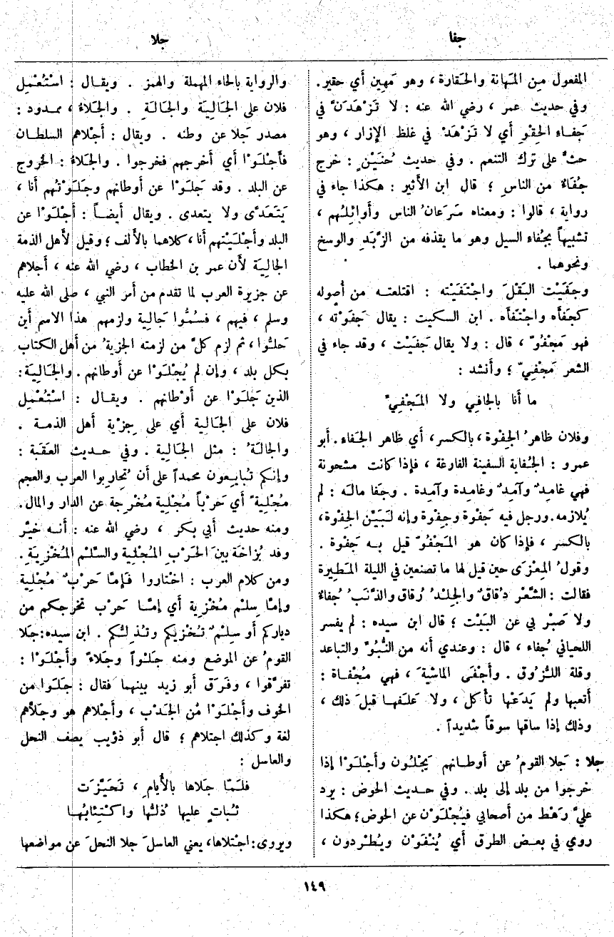 ؛ هَكَذَا رُوِيَ فِي بَعْضِ الطُّرُقِ أَي يُنْفَوْن ويُطْردون، وَالرِّوَايَةُ بِالْحَاءِ الْمُهْمَلَةِ وَالْهَمْزِ. وَيُقَالُ: اسْتُعْمِل فُلَانٌ عَلَى الجَالِيَة والجَالَةِ. والجَلاءُ، مَمْدُودٌ: مَصْدَرُ جَلا عَنْ وَطَنِهِ. وَيُقَالُ: أَجْلاهم السُّلْطَانُ فأَجْلَوْا أَي أَخرجهم فَخَرَجُوا. والجَلاءُ: الْخُرُوجُ عَنِ الْبَلَدِ. وَقَدْ جَلَوْا عَنْ أَوطانهم وجَلَوْتُهم أَنا، يَتَعَدَّى، وَلَا يَتَعَدَّى. وَيُقَالُ أَيضاً: أَجْلَوْا عَنِ الْبَلَدِ وأَجْلَيْتهم أَنا، كِلَاهُمَا بالأَلف؛ وَقِيلَ لأَهل الذِّمَّةِ الجَالِيَة لأَن عُمَرَ بْنَ الْخَطَّابِ، رَضِيَ اللَّهُ عَنْهُ، أَجلاهم عَنْ جَزِيرَةِ الْعَرَبِ لِمَا تَقَدَّمَ مِنْ أَمر النَّبِيِّ، صَلَّى اللَّهُ عليه وسلم، فيهم، فسُمُّوا جَالِيَة وَلَزِمَهُمْ هَذَا الِاسْمُ أَين حَلُّوا، ثُمَّ لَزِمَ كلَّ مَنْ لَزِمَتْهُ الجزيةُ مِنْ أَهل الْكِتَابِ بِكُلِّ بَلَدٍ، وإِن لَمْ يُجْلَوْا عَنْ أَوطانهم. والجَالِيَة: الَّذِينَ جَلَوْا عَنْ أَوْطانهم. وَيُقَالُ: اسْتُعْمِل فُلَانٌ عَلَى الجَالِيَة أَي عَلَى جِزْية أَهل الذِّمَّةِ. والجَالَةُ: مِثْلُ الجَالِية. وَفِي حَدِيثِ العَقَبة: